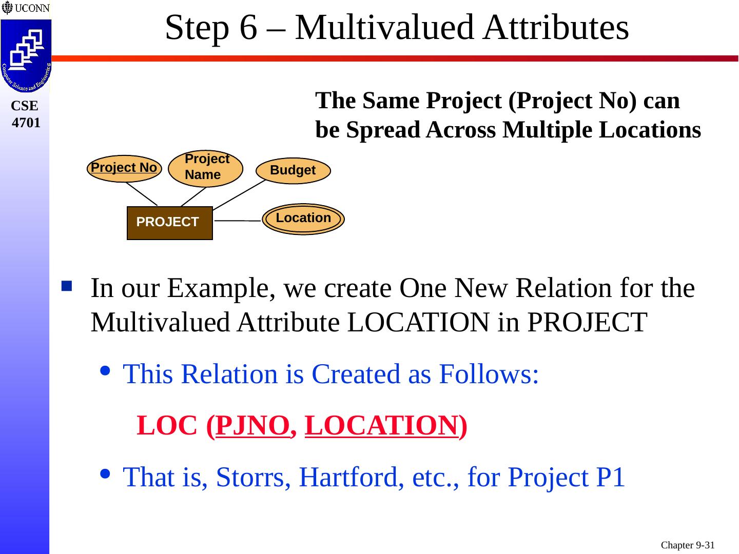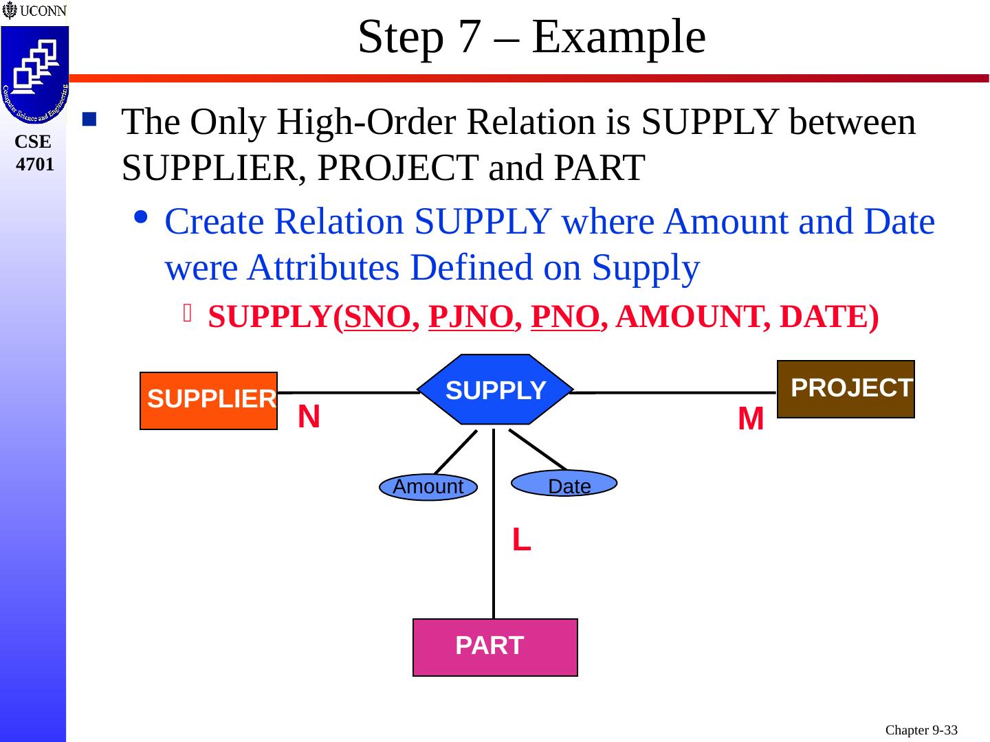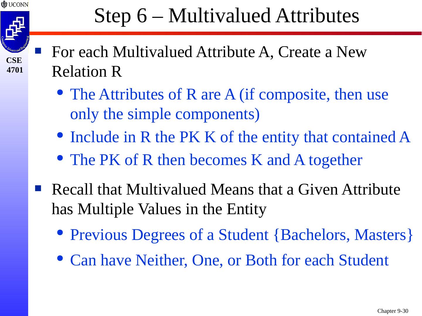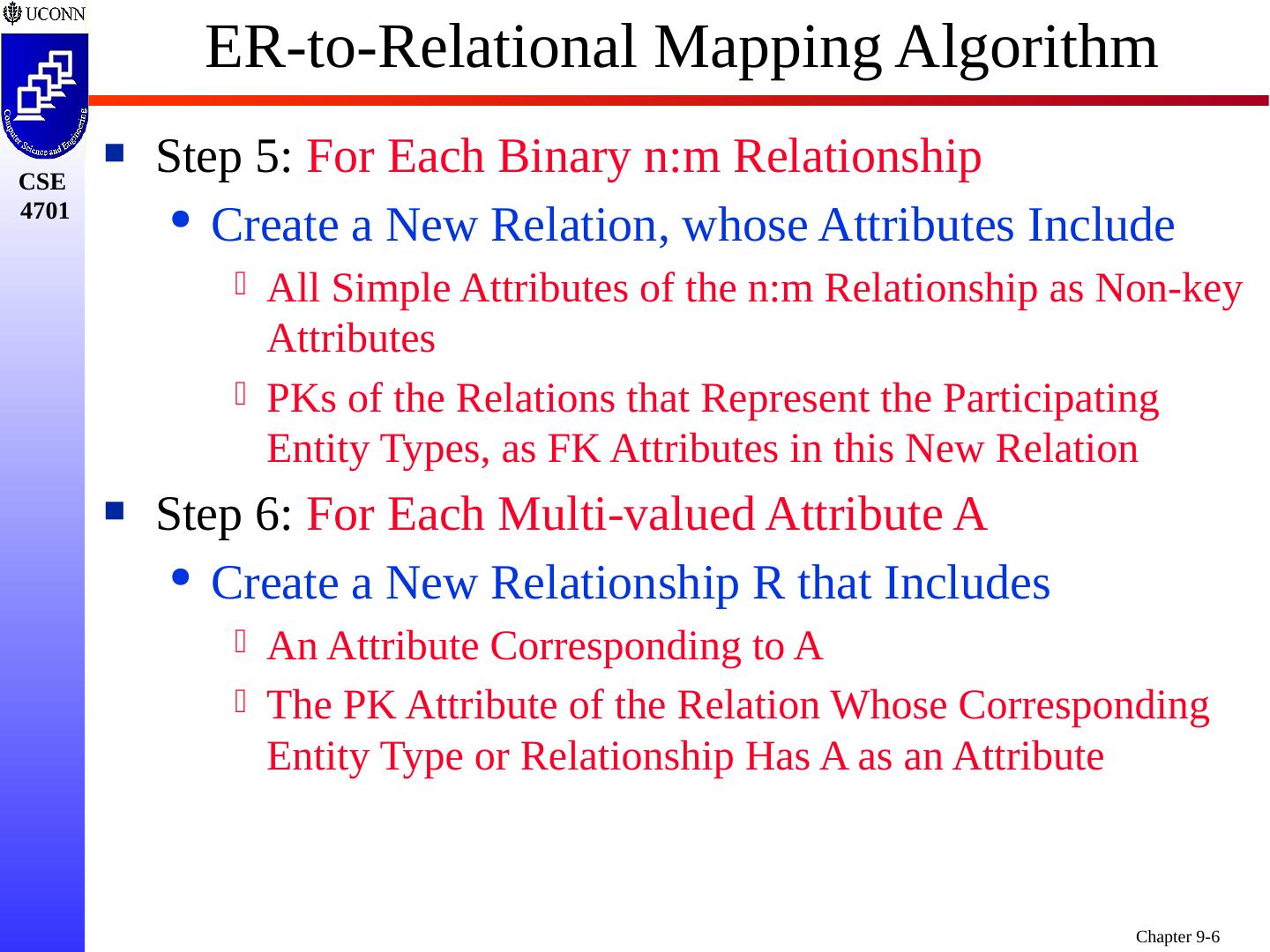 6 .ER-to-Relational Mapping Algorithm Step 5: For Each Binary n:m Relationship Create a New Relation, whose Attributes Include All Simple Attributes of the n:m Relationship as Non-key Attributes PKs of the Relations that Represent the Participating Entity Types, as FK Attributes in this New Relation Step 6: For Each Multi-valued Attribute A Create a New Relationship R that Includes An Attribute Corresponding to A The PK Attribute of the Relation Whose Corresponding Entity Type or Relationship Has A as an Attribute