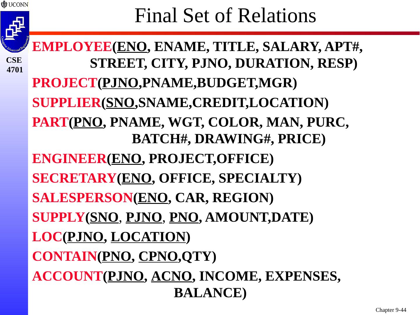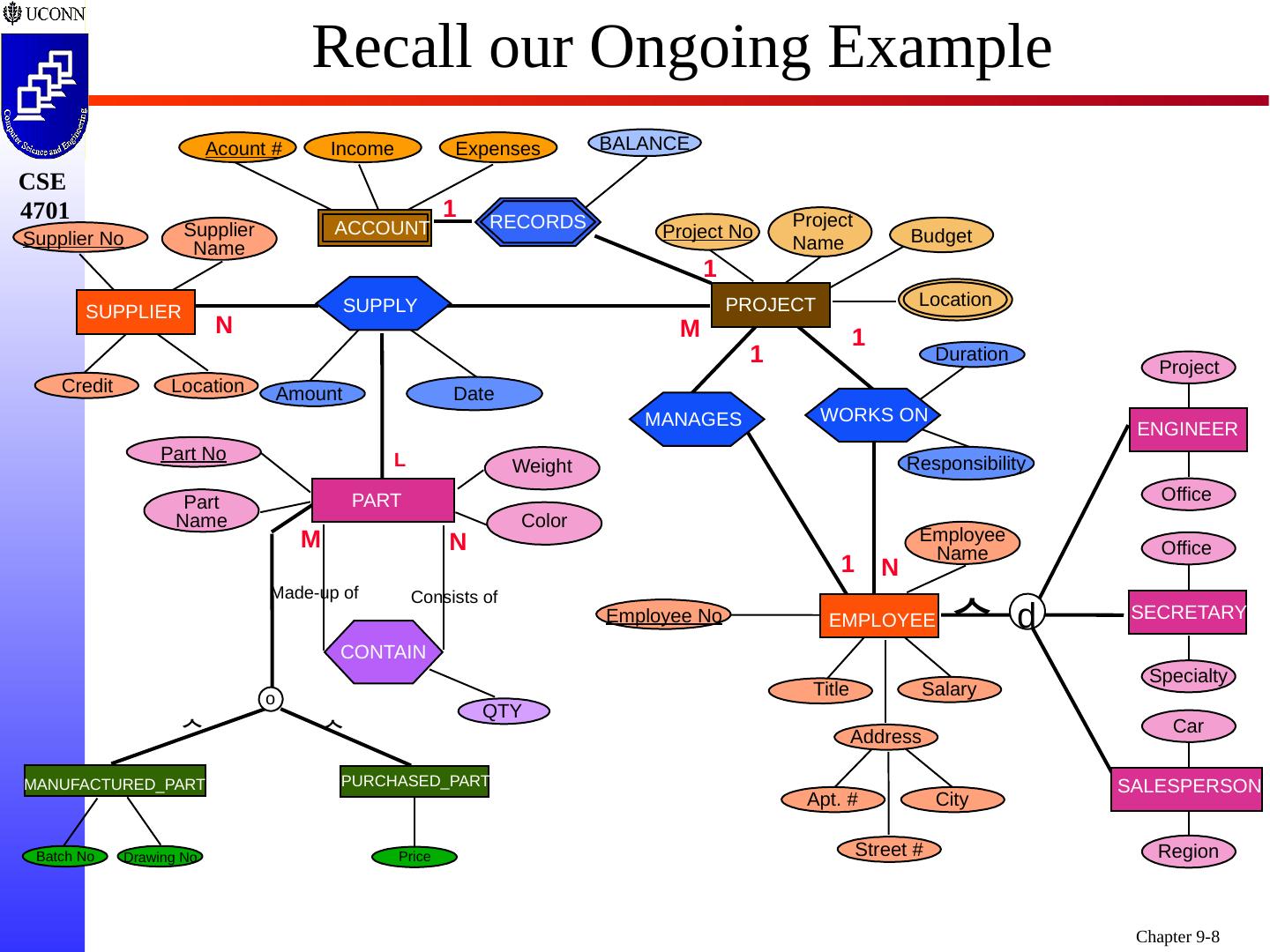 8 .Recall our Ongoing Example EMPLOYEE PROJECT Responsibility Duration Budget Project Name Project No Employee No Employee Name Salary Title WORKS ON Address City Apt. # Street # Location 1 N MANAGES BALANCE Expenses 1 RECORDS ACCOUNT Income 1 Date Amount SUPPLY SUPPLIER Supplier No Supplier Name Location Credit N M PART L Part No Part Name Weight Color CONTAIN M N Made-up of Consists of 1 1 QTY SALESPERSON Car Region SECRETARY Specialty Office ENGINEER Project Office Acount # d o MANUFACTURED_PART PURCHASED_PART Batch No Drawing No Price