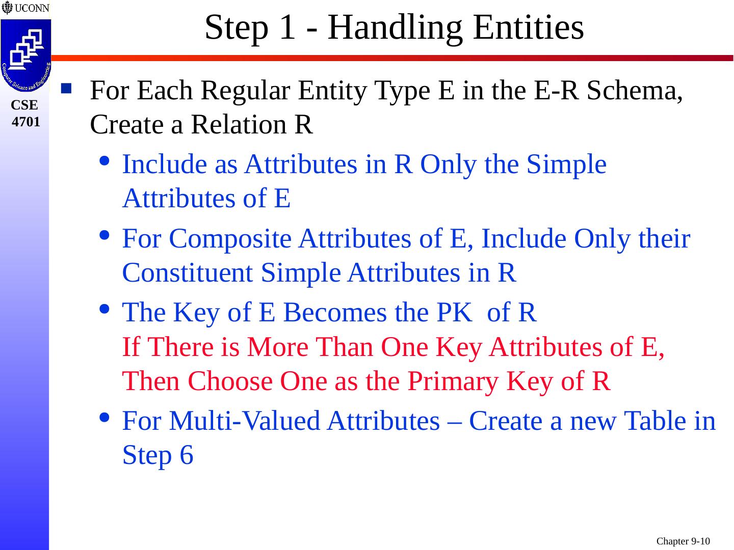 10 .Step 1 - Handling Entities For Each Regular Entity Type E in the E-R Schema, Create a Relation R Include as Attributes in R Only the Simple Attributes of E For Composite Attributes of E, Include Only their Constituent Simple Attributes in R The Key of E Becomes the PK of R If There is More Than One Key Attributes of E, Then Choose One as the Primary Key of R For Multi-Valued Attributes – Create a new Table in Step 6