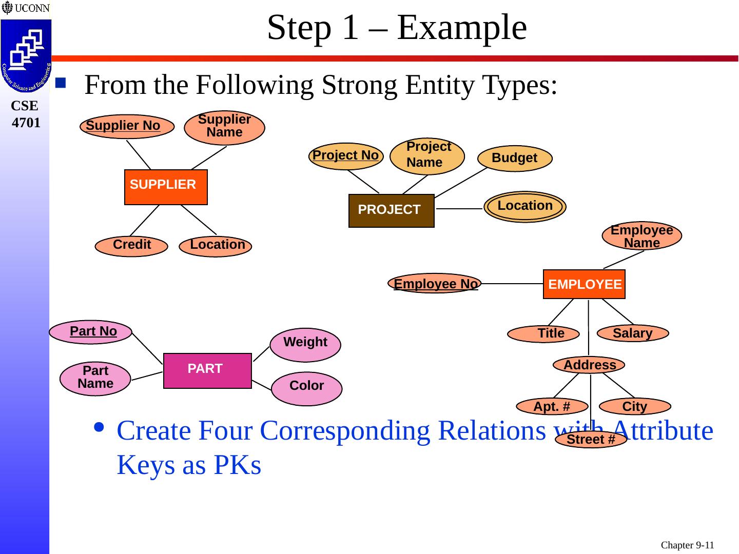 11 .From the Following Strong Entity Types: Create Four Corresponding Relations with Attribute Keys as PKs Step 1 – Example SUPPLIER Supplier No Supplier Name Location Credit PROJECT Budget Project Name Project No Location PART Part No Part Name Weight Color EMPLOYEE Employee No Employee Name Salary Title Address City Apt. # Street #