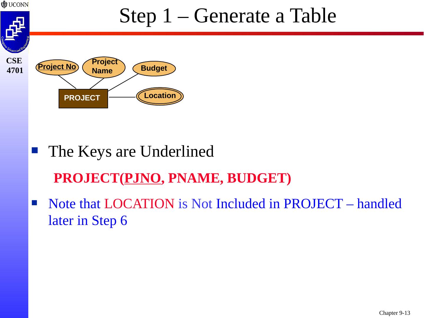 13 . Step 1 – Generate a Table PROJECT Budget Project Name Project No Location The Keys are Underlined PROJECT( PJNO , PNAME, BUDGET) Note that LOCATION is Not Included in PROJECT – handled later in Step 6