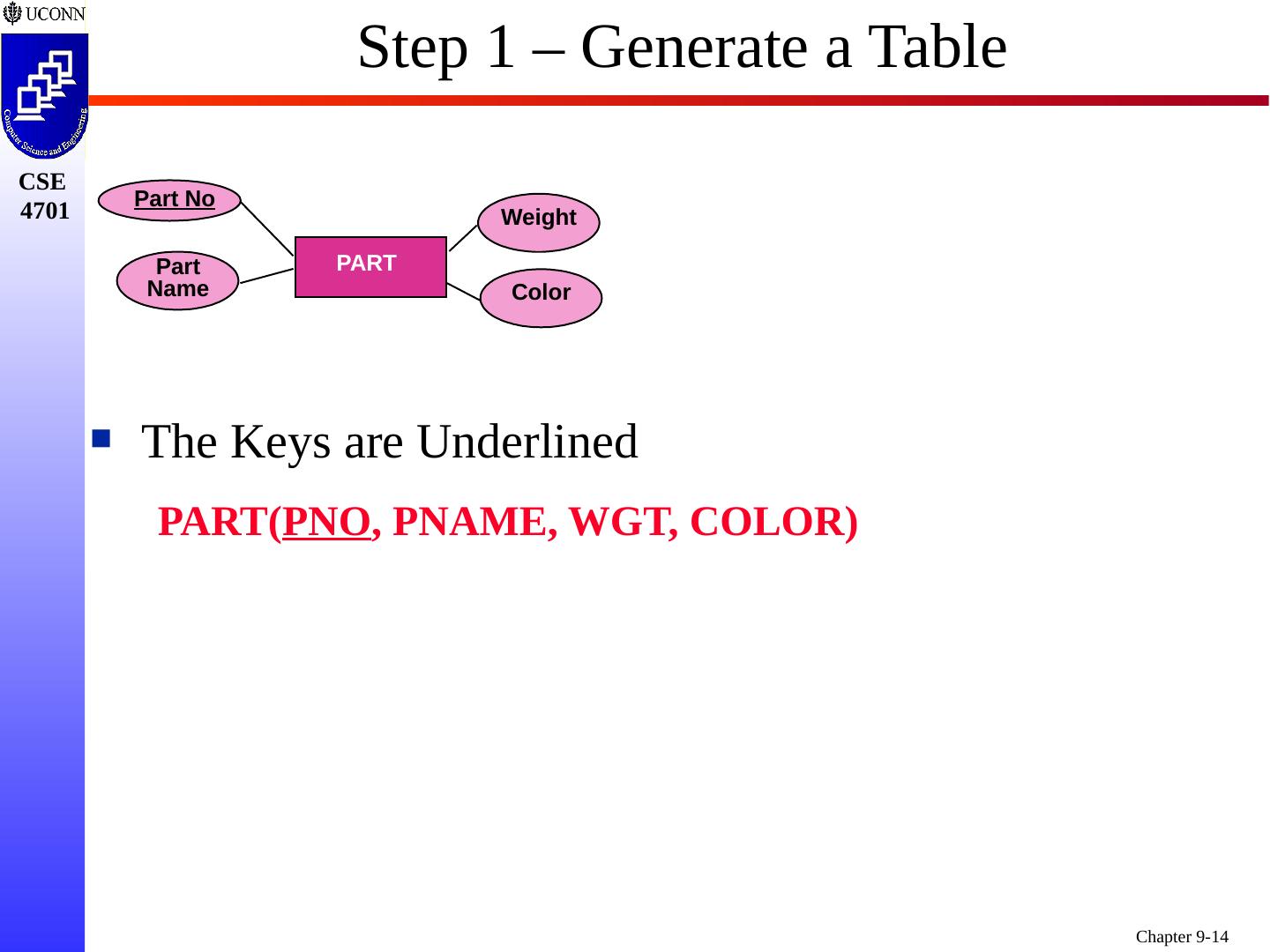14 . Step 1 – Generate a Table PART Part No Part Name Weight Color The Keys are Underlined PART( PNO , PNAME, WGT, COLOR)