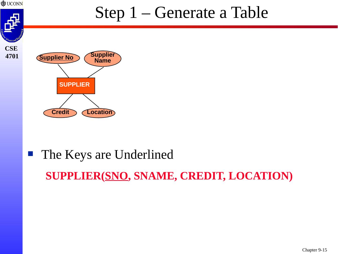 15 . Step 1 – Generate a Table SUPPLIER Supplier No Supplier Name Location Credit The Keys are Underlined SUPPLIER( SNO , SNAME, CREDIT, LOCATION)