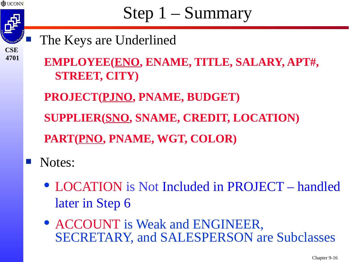 16 . The Keys are Underlined EMPLOYEE( ENO , ENAME, TITLE, SALARY, APT#, STREET, CITY) PROJECT( PJNO , PNAME, BUDGET) SUPPLIER( SNO , SNAME, CREDIT, LOCATION) PART( PNO , PNAME, WGT, COLOR) Notes: LOCATION is Not Included in PROJECT – handled later in Step 6 ACCOUNT is Weak and ENGINEER, SECRETARY, and SALESPERSON are Subclasses Step 1 – Summary