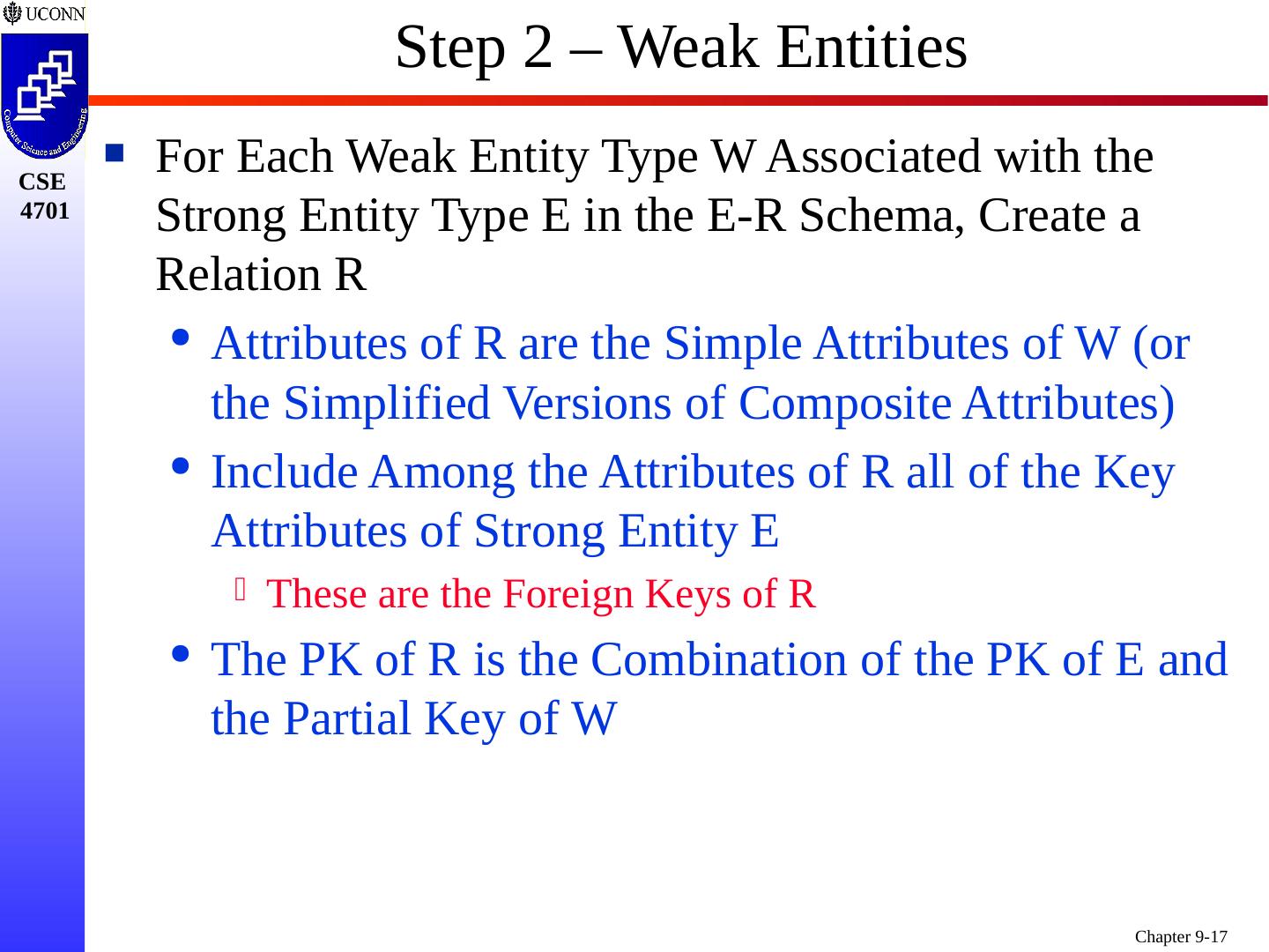 17 . Step 2 – Weak Entities For Each Weak Entity Type W Associated with the Strong Entity Type E in the E-R Schema, Create a Relation R Attributes of R are the Simple Attributes of W (or the Simplified Versions of Composite Attributes) Include Among the Attributes of R all of the Key Attributes of Strong Entity E These are the Foreign Keys of R The PK of R is the Combination of the PK of E and the Partial Key of W