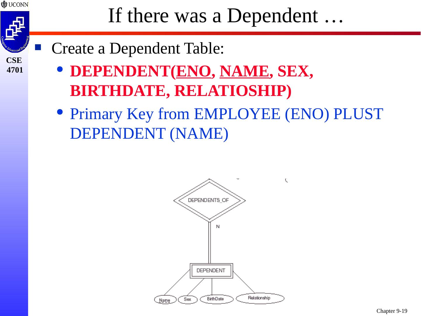 19 .If there was a Dependent … Create a Dependent Table: DEPENDENT( ENO , NAME , SEX, BIRTHDATE, RELATIOSHIP) Primary Key from EMPLOYEE (ENO) PLUST DEPENDENT (NAME)