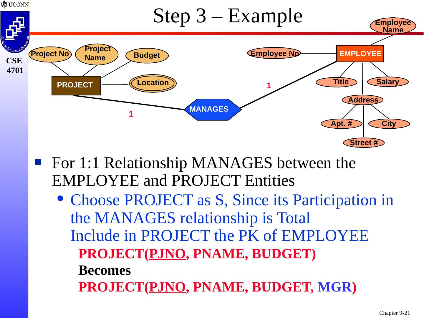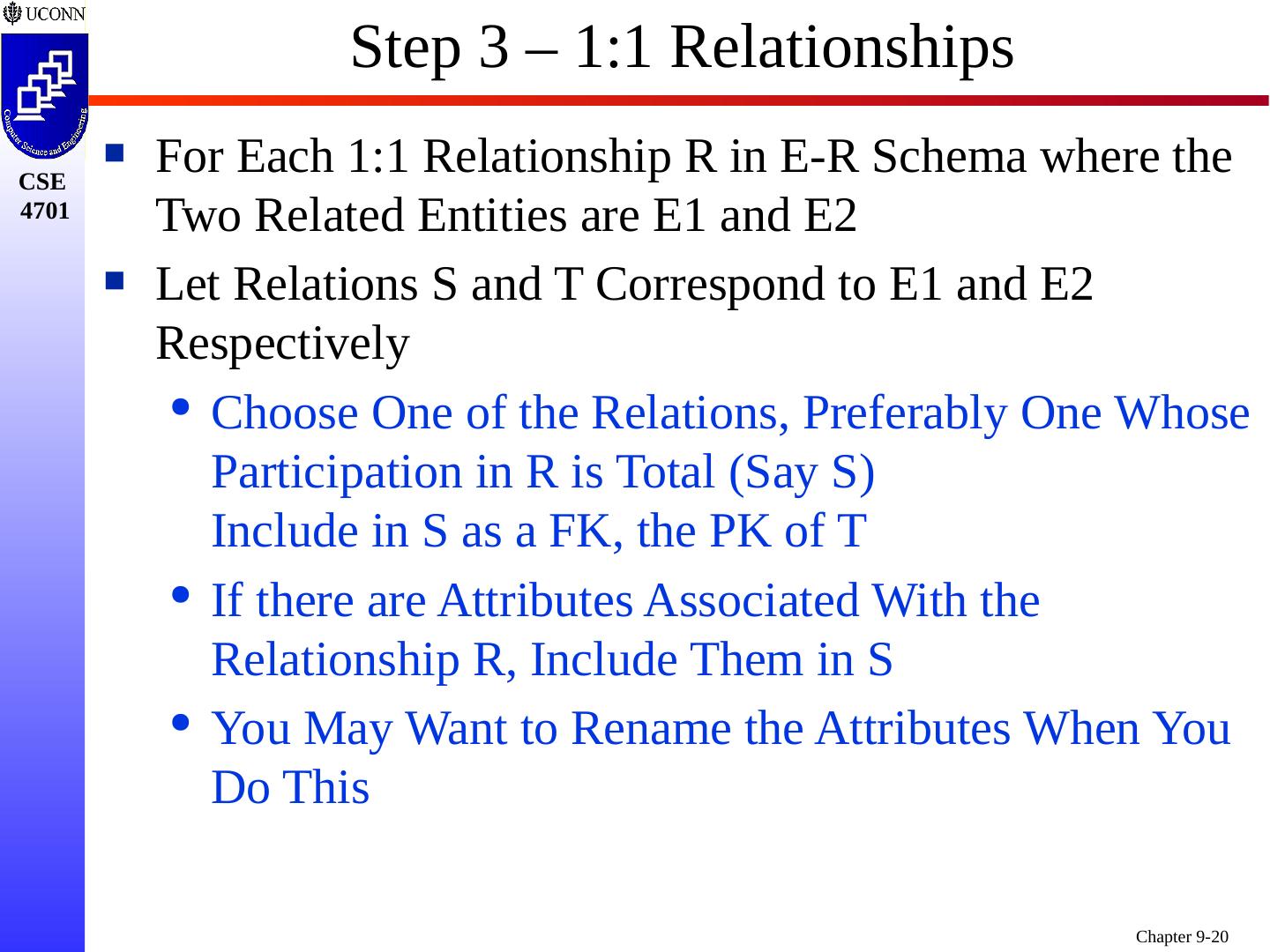 20 . Step 3 – 1:1 Relationships For Each 1:1 Relationship R in E-R Schema where the Two Related Entities are E1 and E2 Let Relations S and T Correspond to E1 and E2 Respectively Choose One of the Relations, Preferably One Whose Participation in R is Total (Say S) Include in S as a FK, the PK of T If there are Attributes Associated With the Relationship R, Include Them in S You May Want to Rename the Attributes When You Do This
