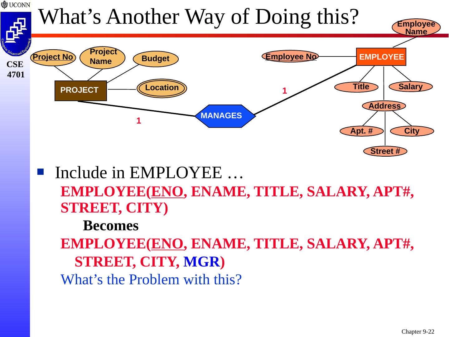 22 . Include in EMPLOYEE … EMPLOYEE( ENO , ENAME, TITLE, SALARY, APT#, STREET, CITY) Becomes EMPLOYEE( ENO , ENAME, TITLE, SALARY, APT#, STREET, CITY, MGR ) What’s the Problem with this? What’s Another Way of Doing this? MANAGES 1 1 PROJECT Budget Project Name Project No Location EMPLOYEE Employee No Employee Name Salary Title Address City Apt. # Street #