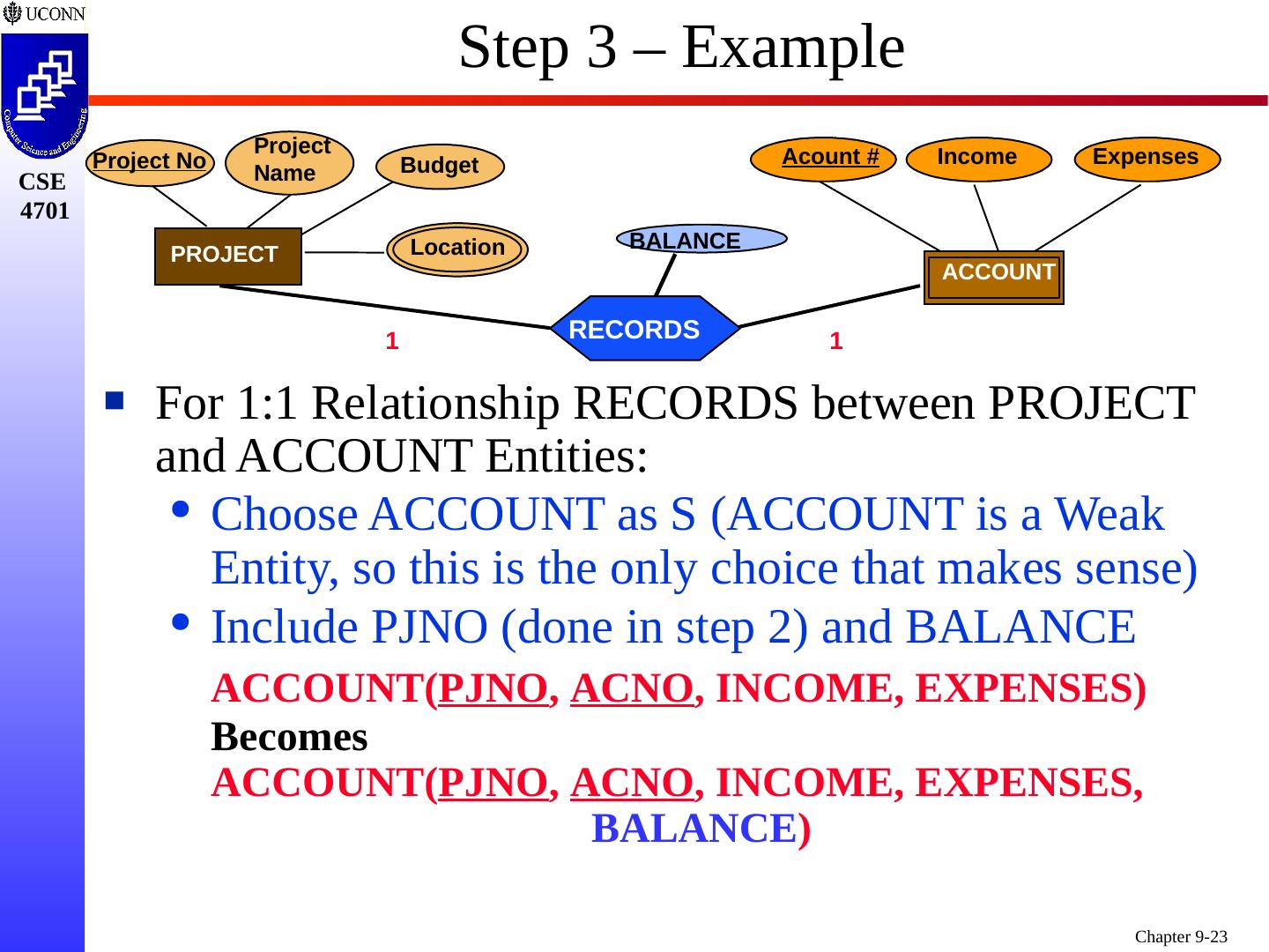 23 . For 1:1 Relationship RECORDS between PROJECT and ACCOUNT Entities: Choose ACCOUNT as S (ACCOUNT is a Weak Entity, so this is the only choice that makes sense) Include PJNO (done in step 2) and BALANCE ACCOUNT( PJNO , ACNO , INCOME, EXPENSES) Becomes ACCOUNT( PJNO , ACNO , INCOME, EXPENSES, BALANCE ) Step 3 – Example RECORDS 1 1 PROJECT Budget Project Name Project No Location BALANCE Expenses ACCOUNT Income Acount #