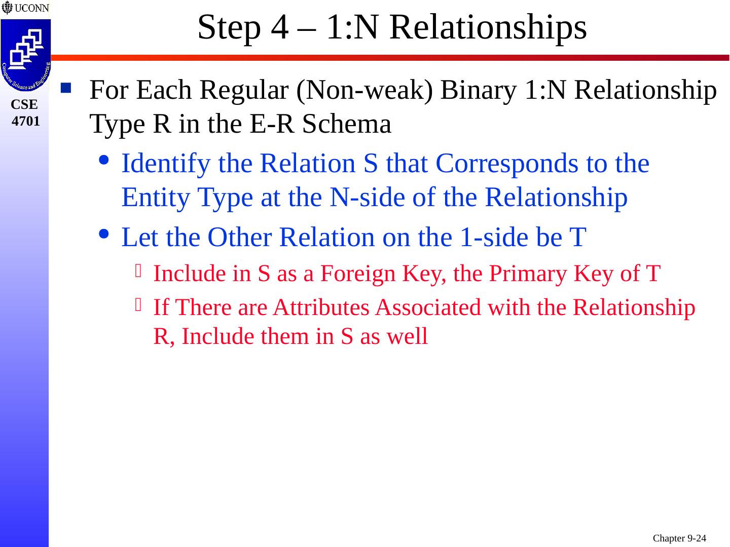 24 . For Each Regular (Non-weak) Binary 1:N Relationship Type R in the E-R Schema Identify the Relation S that Corresponds to the Entity Type at the N-side of the Relationship Let the Other Relation on the 1-side be T Include in S as a Foreign Key, the Primary Key of T If There are Attributes Associated with the Relationship R, Include them in S as well Step 4 – 1:N Relationships