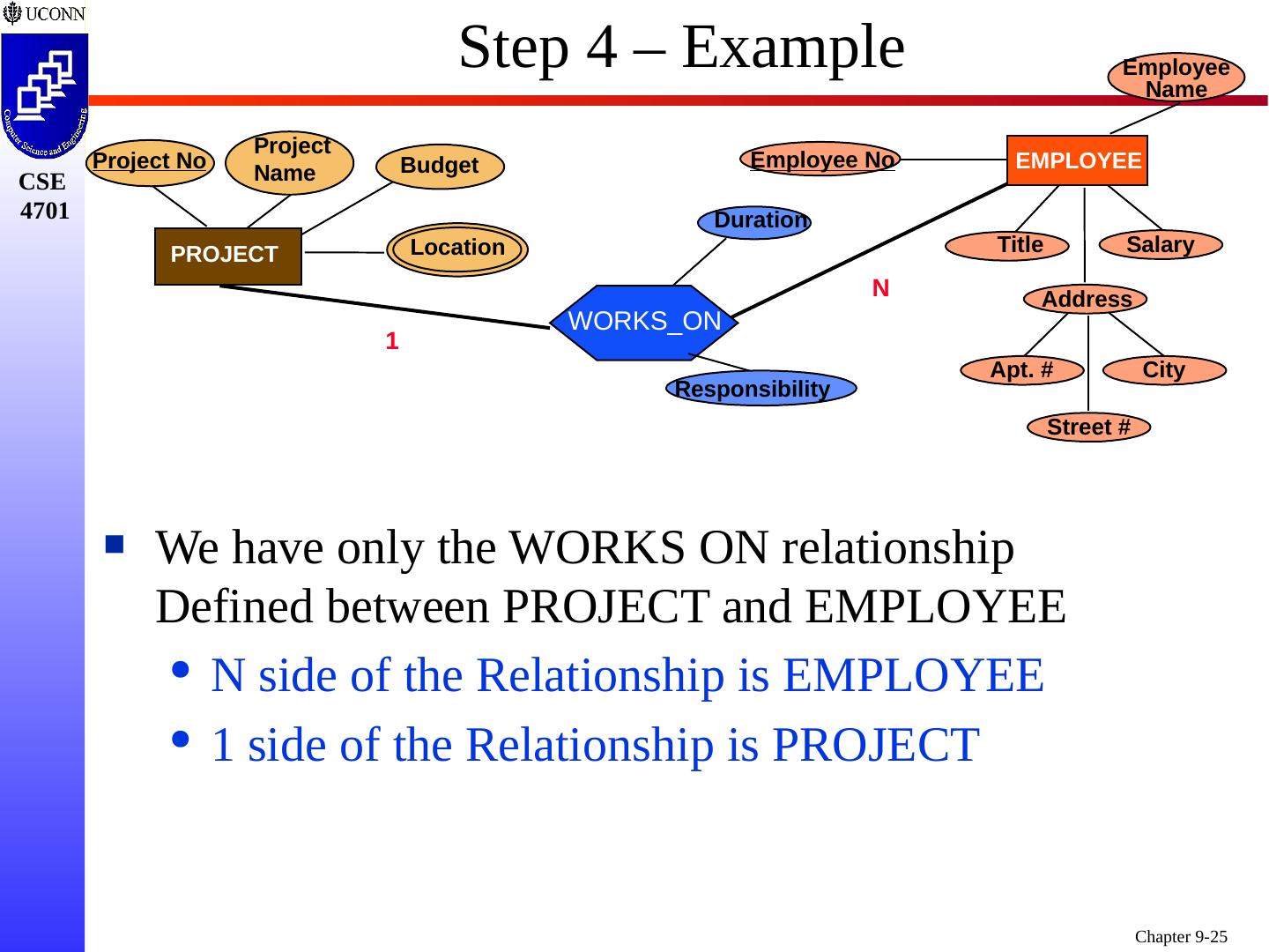 25 . Step 4 – Example We have only the WORKS ON relationship Defined between PROJECT and EMPLOYEE N side of the Relationship is EMPLOYEE 1 side of the Relationship is PROJECT WORKS_ON 1 N PROJECT Budget Project Name Project No Location EMPLOYEE Employee No Employee Name Salary Title Address City Apt. # Street # Responsibility Duration