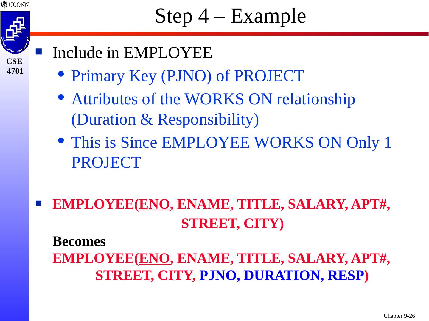 26 . Step 4 – Example Include in EMPLOYEE Primary Key (PJNO) of PROJECT Attributes of the WORKS ON relationship (Duration & Responsibility ) This is Since EMPLOYEE WORKS ON Only 1 PROJECT EMPLOYEE( ENO , ENAME, TITLE, SALARY, APT#, STREET, CITY) Becomes EMPLOYEE( ENO , ENAME, TITLE, SALARY, APT#, STREET, CITY, PJNO, DURATION, RESP )