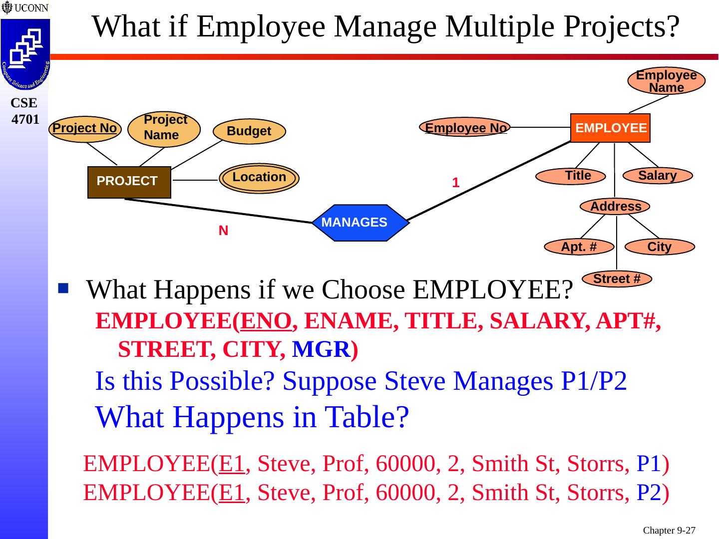 27 . What Happens if we Choose EMPLOYEE? EMPLOYEE( ENO , ENAME, TITLE, SALARY, APT#, STREET, CITY, MGR ) Is this Possible? Suppose Steve Manages P1/P2 What Happens in Table? What if Employee Manage Multiple Projects? MANAGES N 1 PROJECT Budget Project Name Project No Location EMPLOYEE Employee No Employee Name Salary Title Address City Apt. # Street # EMPLOYEE( E1 , Steve, Prof, 60000, 2, Smith St, Storrs, P1 ) EMPLOYEE( E1 , Steve, Prof, 60000, 2, Smith St , Storrs , P2 )