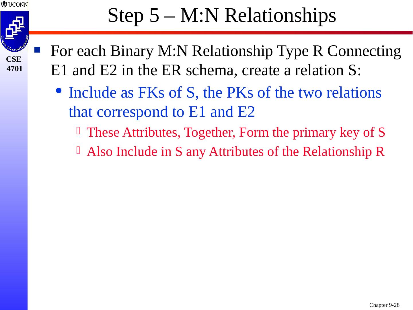 28 . Step 5 – M:N Relationships For each Binary M:N Relationship Type R Connecting E1 and E2 in the ER schema, create a relation S: Include as FKs of S, the PKs of the two relations that correspond to E1 and E2 These Attributes, Together, Form the primary key of S Also Include in S any Attributes of the Relationship R
