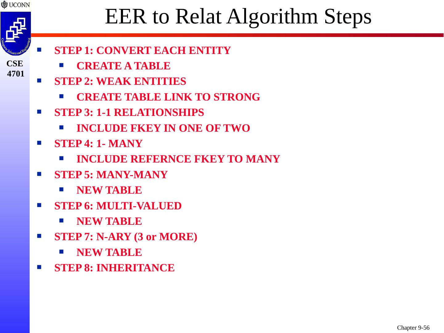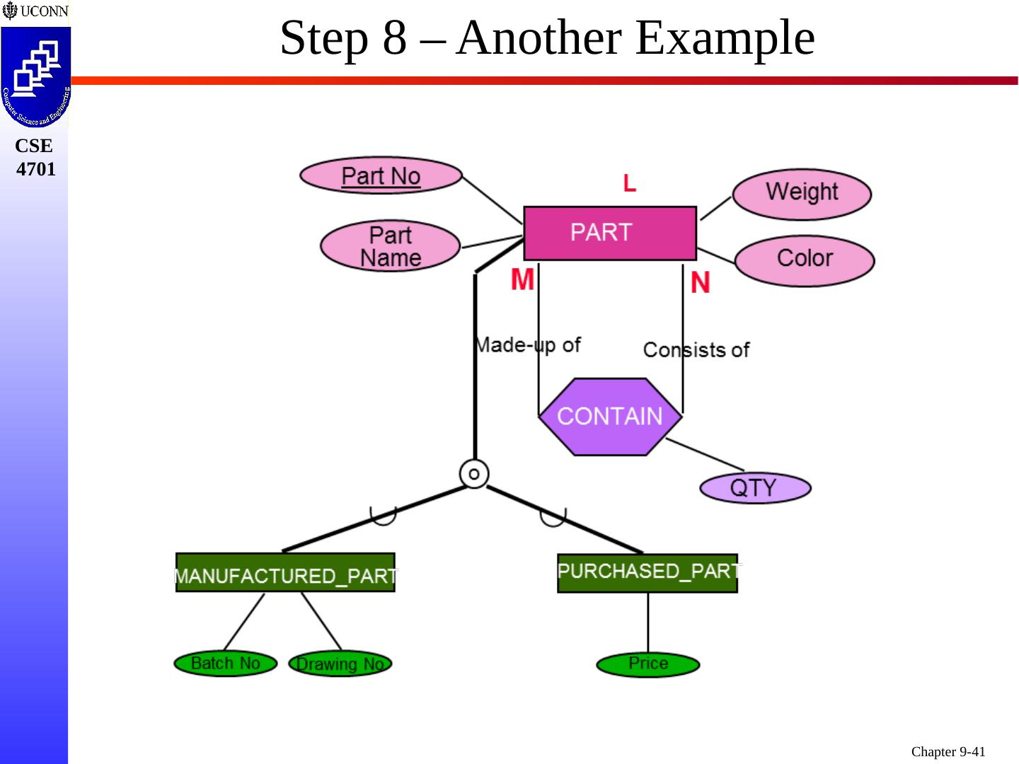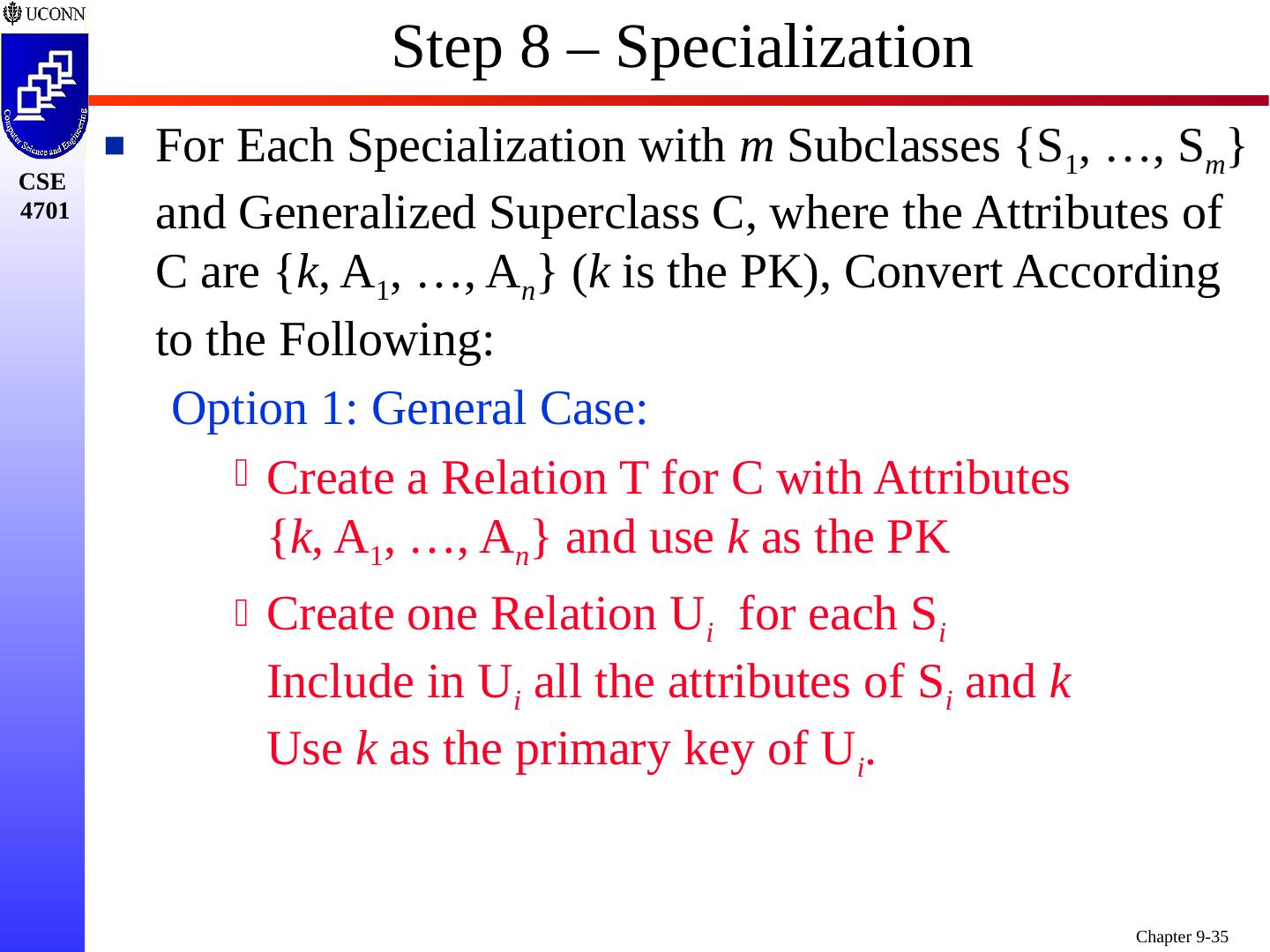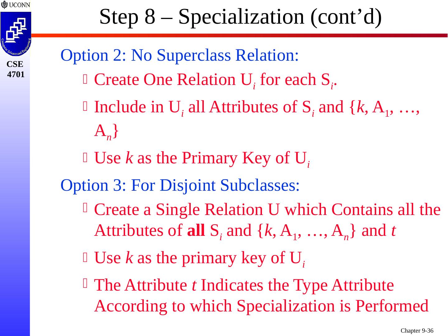 7 .ER-to-Relational Mapping Algorithm Step 7: For Each n-ary Relationship R, n>2 Create a New Relation to Represent R Step 8: Convert Each Specialization for Superclass C with Attributes {k, A 1 , …, A n } (k is the PK), where C has n Subclasses {S 1 , ..., S n } Create a Relation S i for each Subclass Entity (1<= i <= n) with Attributes Attrs(S i ) = {k} {attributes of S i }, and PK{S i } = k Note that the Relation for C was created in an Earlier Step Note also that there are Three Other Options for Mapping Specialization Hierarchies