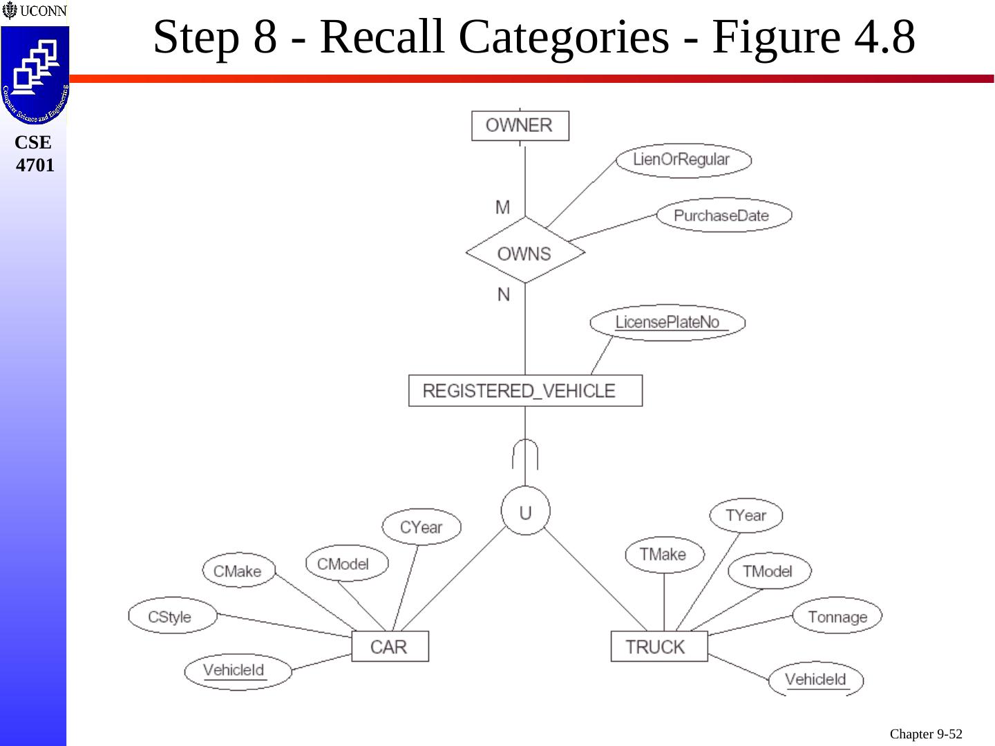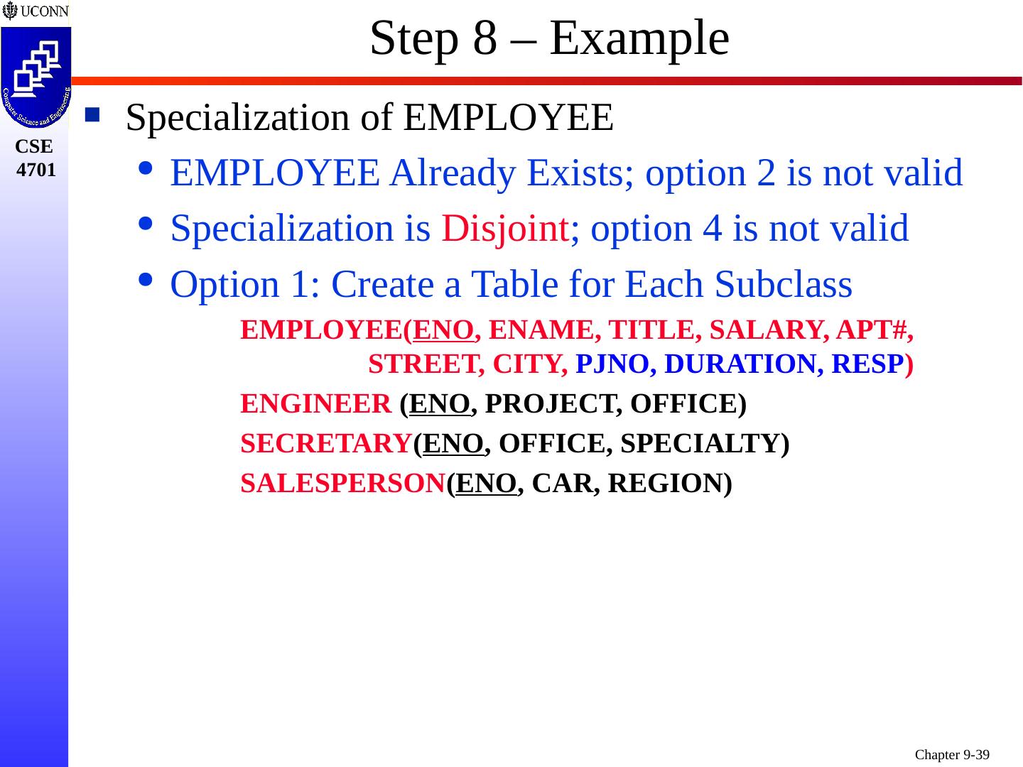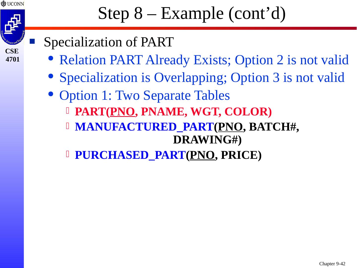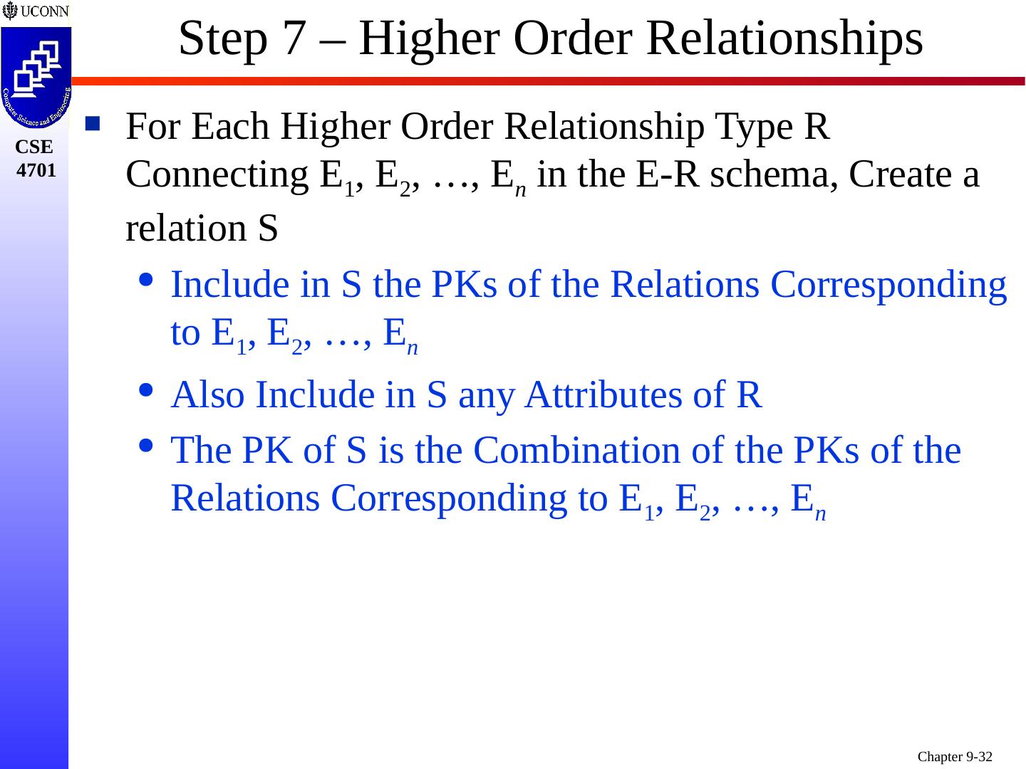 7 .ER-to-Relational Mapping Algorithm Step 7: For Each n-ary Relationship R, n>2 Create a New Relation to Represent R Step 8: Convert Each Specialization for Superclass C with Attributes {k, A 1 , …, A n } (k is the PK), where C has n Subclasses {S 1 , ..., S n } Create a Relation S i for each Subclass Entity (1<= i <= n) with Attributes Attrs(S i ) = {k} {attributes of S i }, and PK{S i } = k Note that the Relation for C was created in an Earlier Step Note also that there are Three Other Options for Mapping Specialization Hierarchies