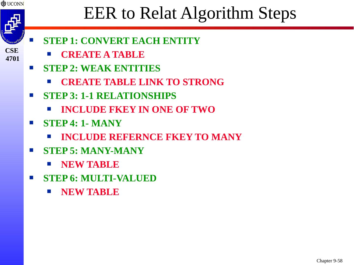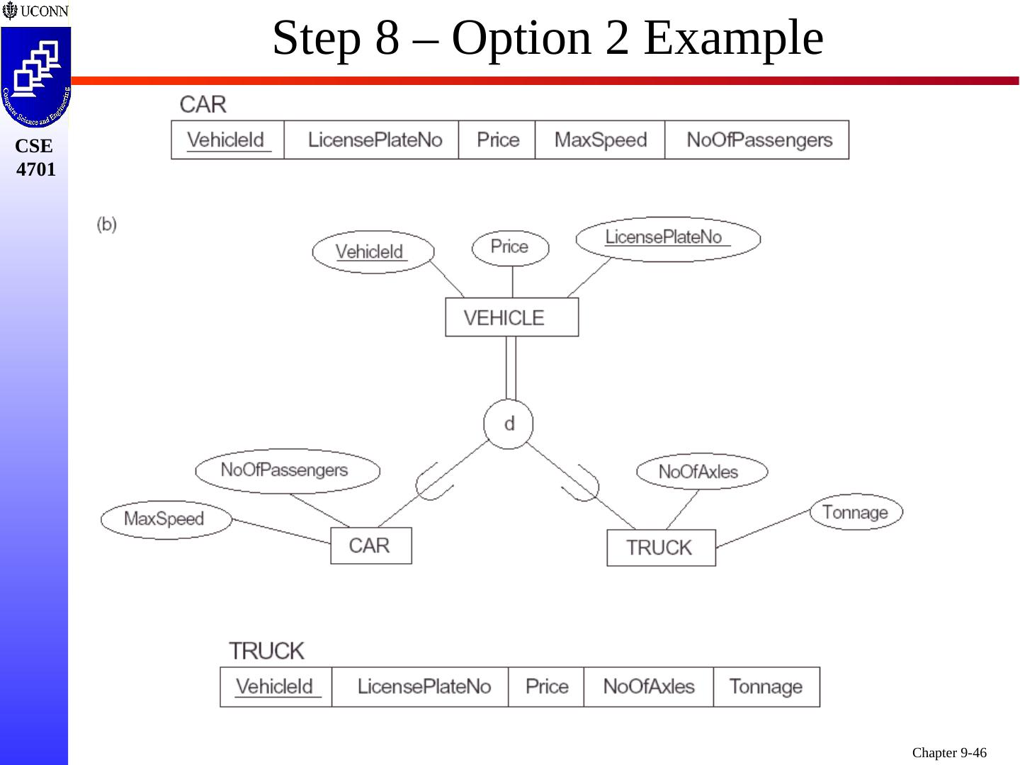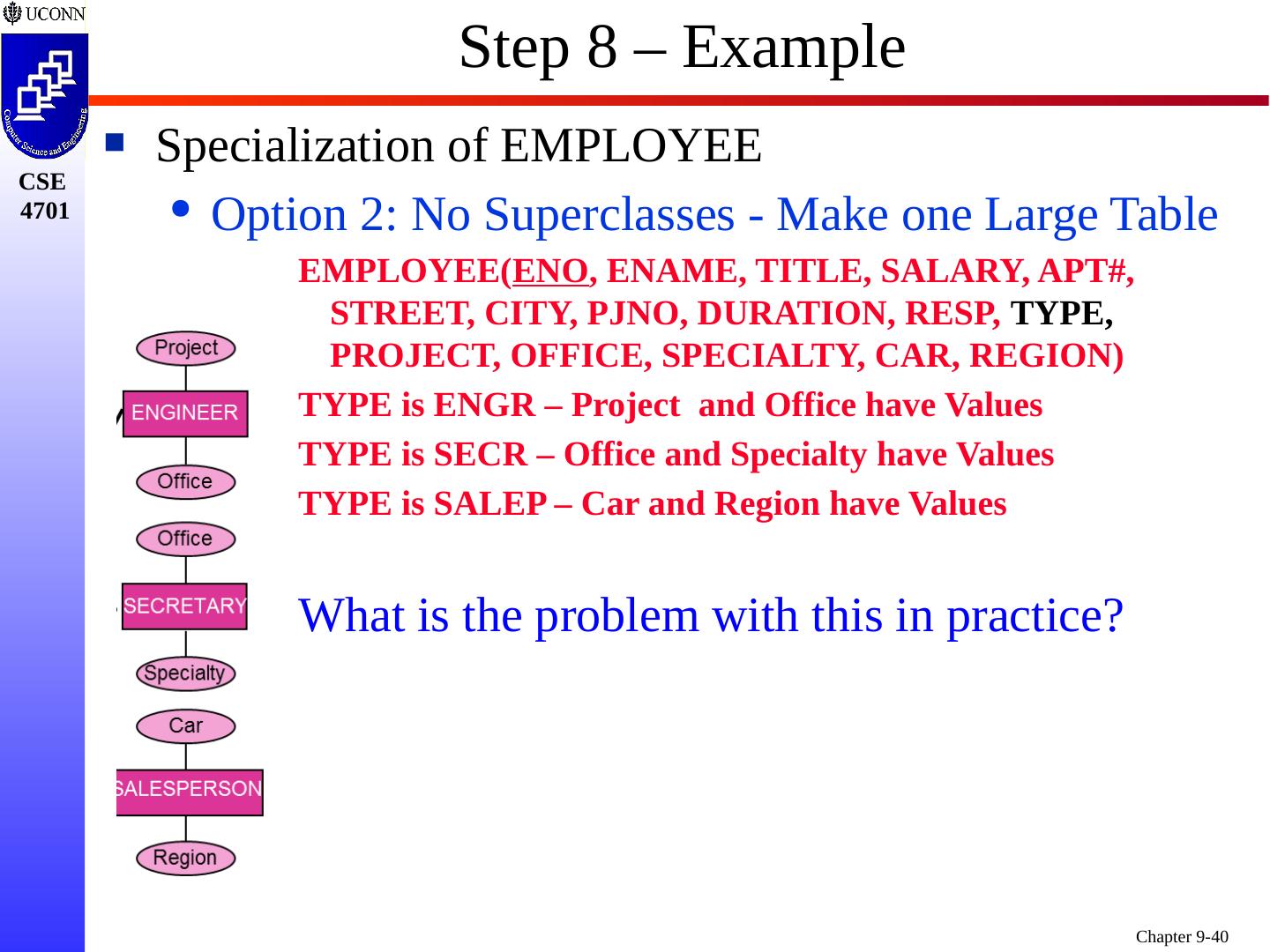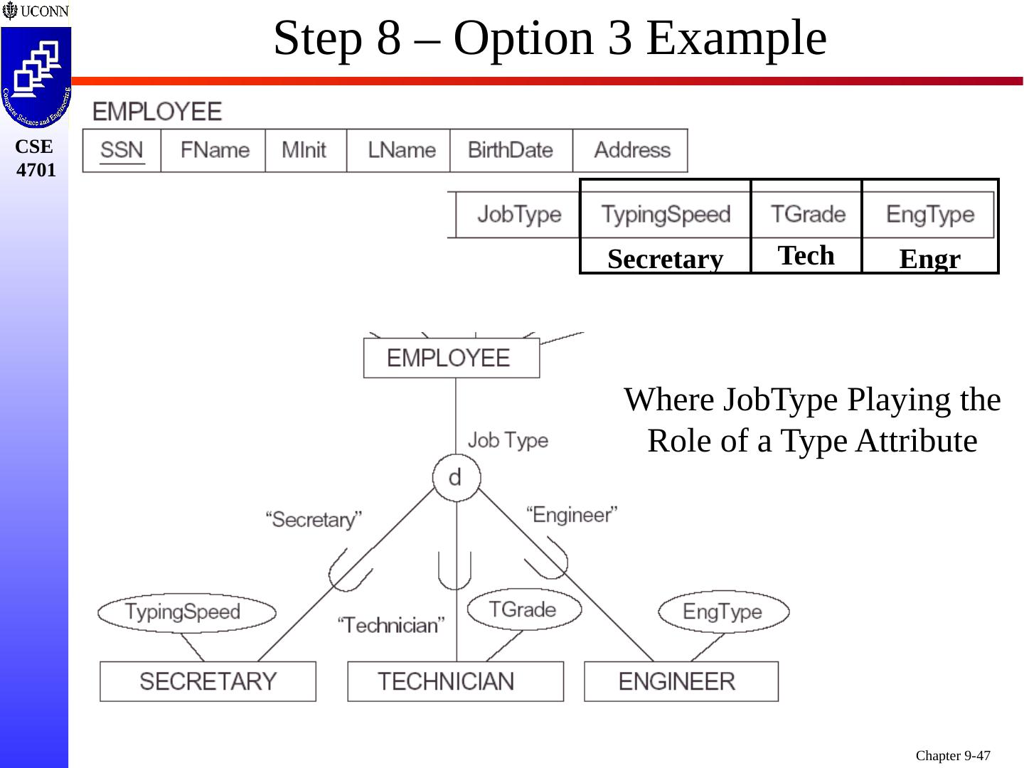 7 .ER-to-Relational Mapping Algorithm Step 7: For Each n-ary Relationship R, n>2 Create a New Relation to Represent R Step 8: Convert Each Specialization for Superclass C with Attributes {k, A 1 , …, A n } (k is the PK), where C has n Subclasses {S 1 , ..., S n } Create a Relation S i for each Subclass Entity (1<= i <= n) with Attributes Attrs(S i ) = {k} {attributes of S i }, and PK{S i } = k Note that the Relation for C was created in an Earlier Step Note also that there are Three Other Options for Mapping Specialization Hierarchies