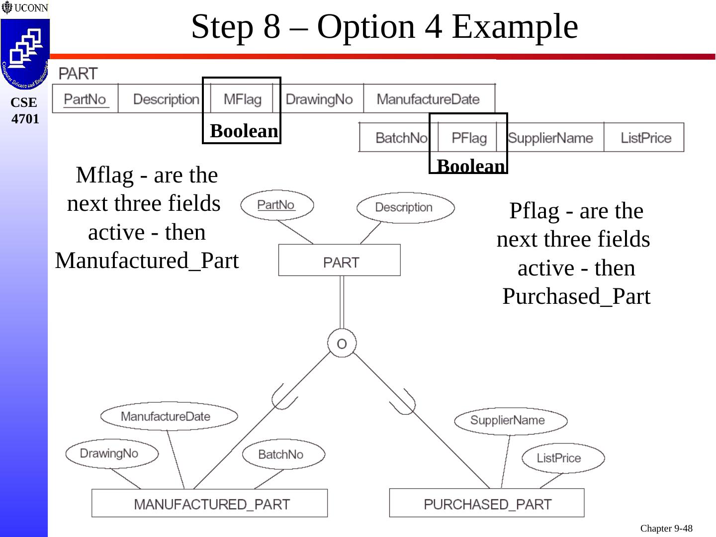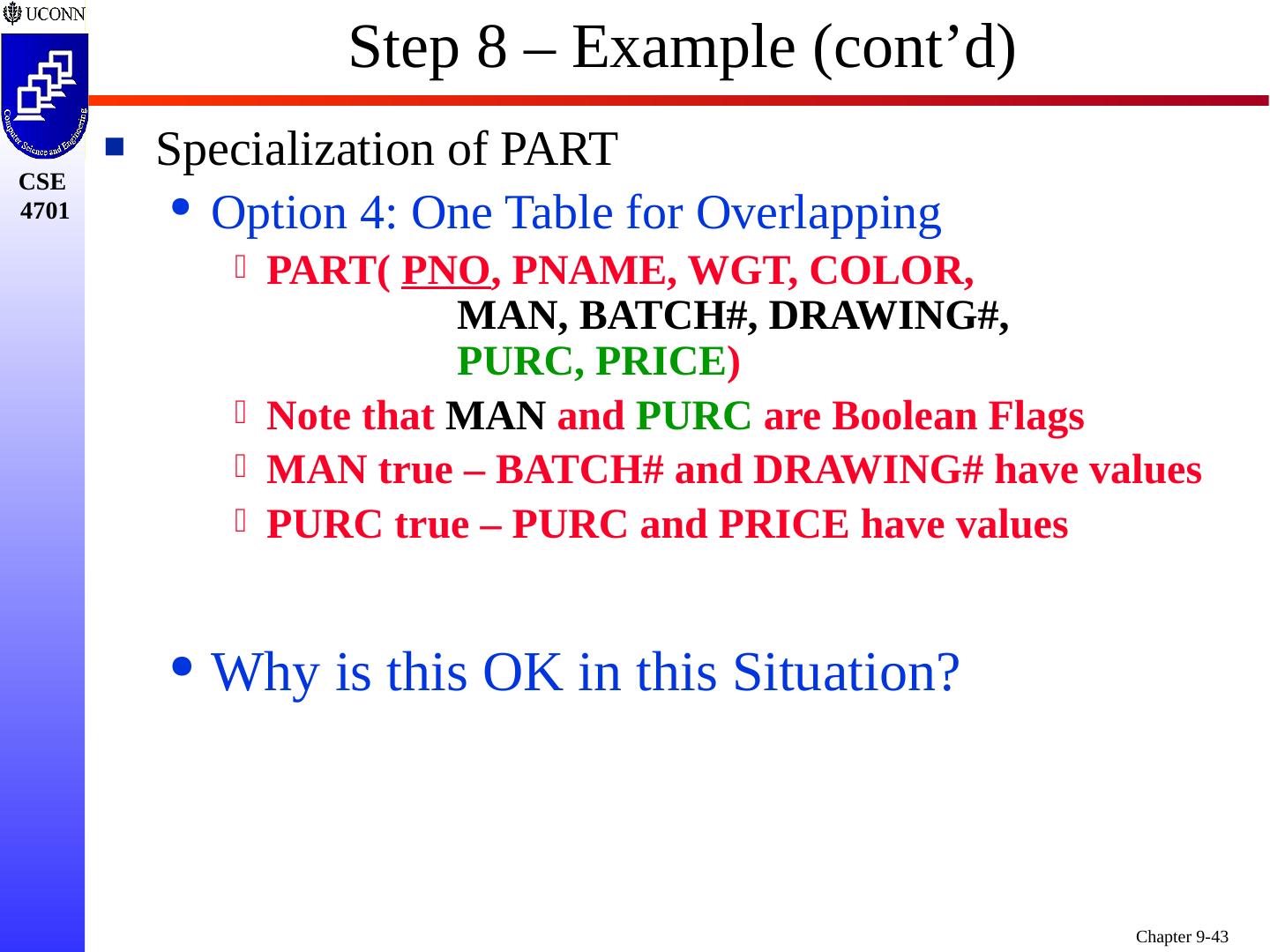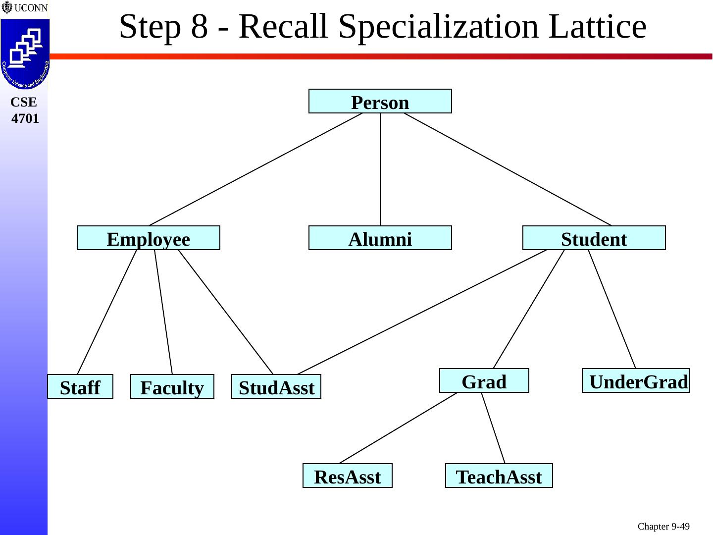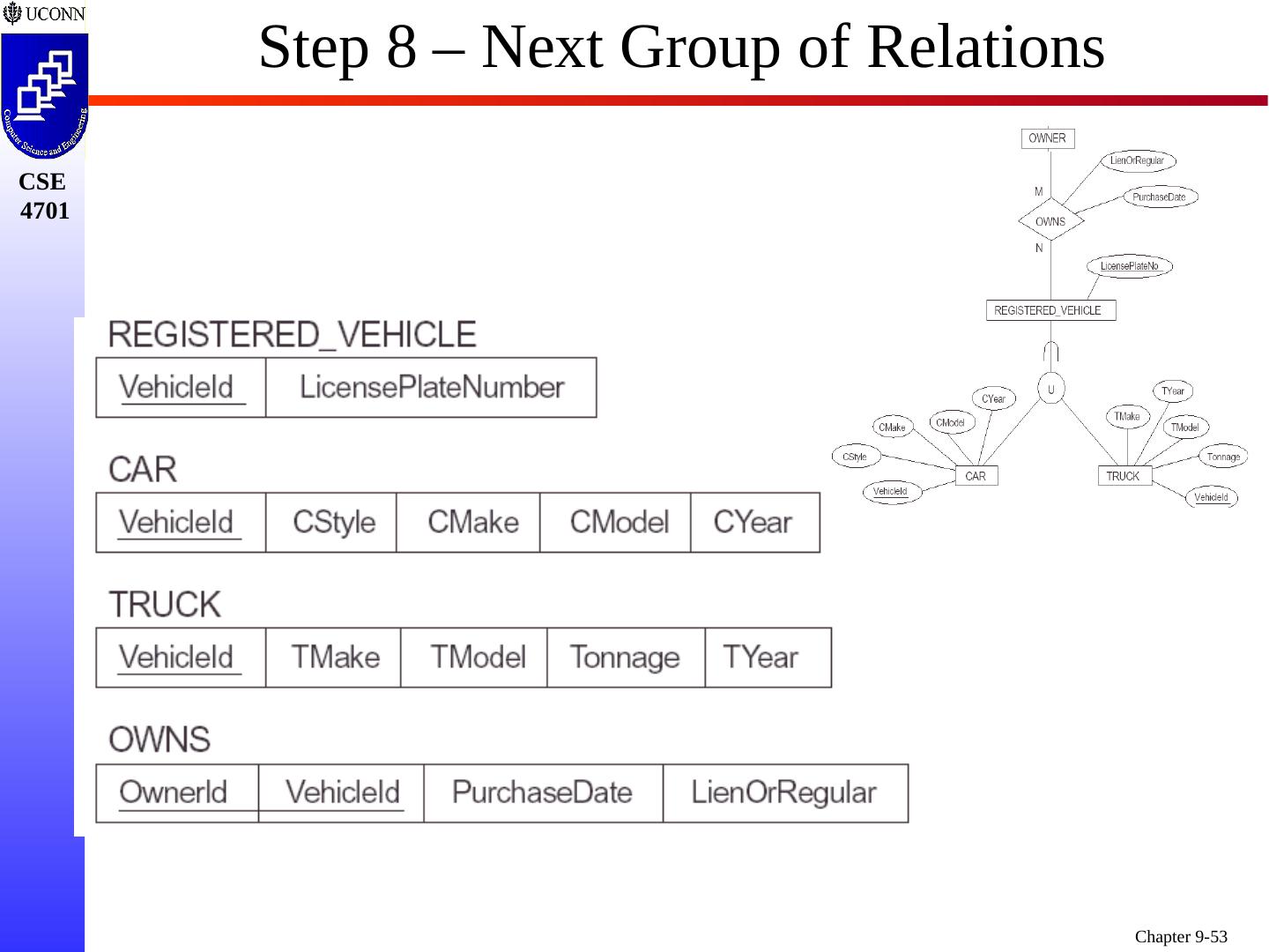 7 .ER-to-Relational Mapping Algorithm Step 7: For Each n-ary Relationship R, n>2 Create a New Relation to Represent R Step 8: Convert Each Specialization for Superclass C with Attributes {k, A 1 , …, A n } (k is the PK), where C has n Subclasses {S 1 , ..., S n } Create a Relation S i for each Subclass Entity (1<= i <= n) with Attributes Attrs(S i ) = {k} {attributes of S i }, and PK{S i } = k Note that the Relation for C was created in an Earlier Step Note also that there are Three Other Options for Mapping Specialization Hierarchies