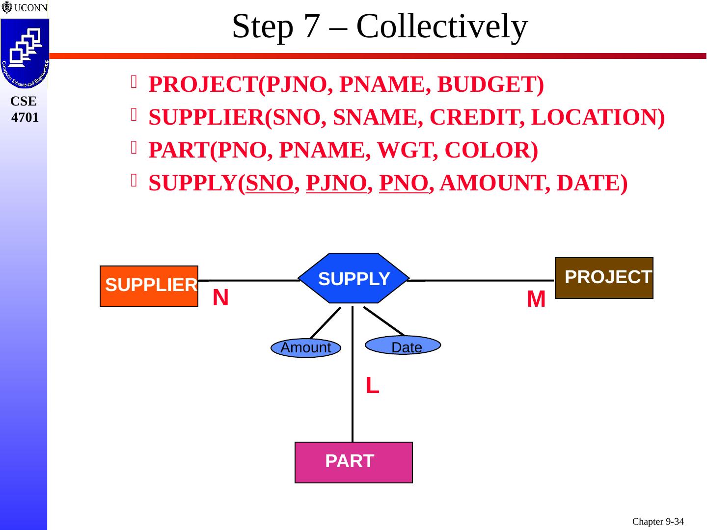 29 . Step 5 – M:N Relationships We have one M:N Relationship: CONTAIN, which is a Recursive Relationship over the PART Entity We create the following relation: CONTAIN( PNO , CPNO , QTY) Recursive Relationship Requires us to Distinguish the Part No as PNO and CPNO PART Part No Part Name Weight Color CONTAIN M N Made-up of Consists of QTY