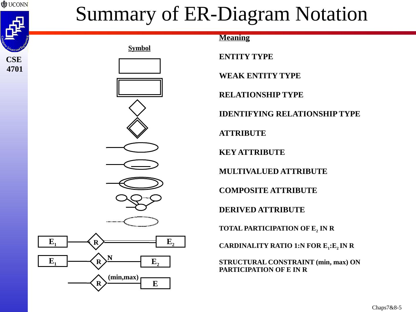 5 .Summary of ER-Diagram Notation Meaning ENTITY TYPE WEAK ENTITY TYPE RELATIONSHIP TYPE IDENTIFYING RELATIONSHIP TYPE ATTRIBUTE KEY ATTRIBUTE MULTIVALUED ATTRIBUTE COMPOSITE ATTRIBUTE DERIVED ATTRIBUTE TOTAL PARTICIPATION OF E 2 IN R CARDINALITY RATIO 1:N FOR E 1 :E 2 IN R STRUCTURAL CONSTRAINT (min, max) ON PARTICIPATION OF E IN R Symbol E 1 R E 2 E 1 R N E 2 R (min,max) E N