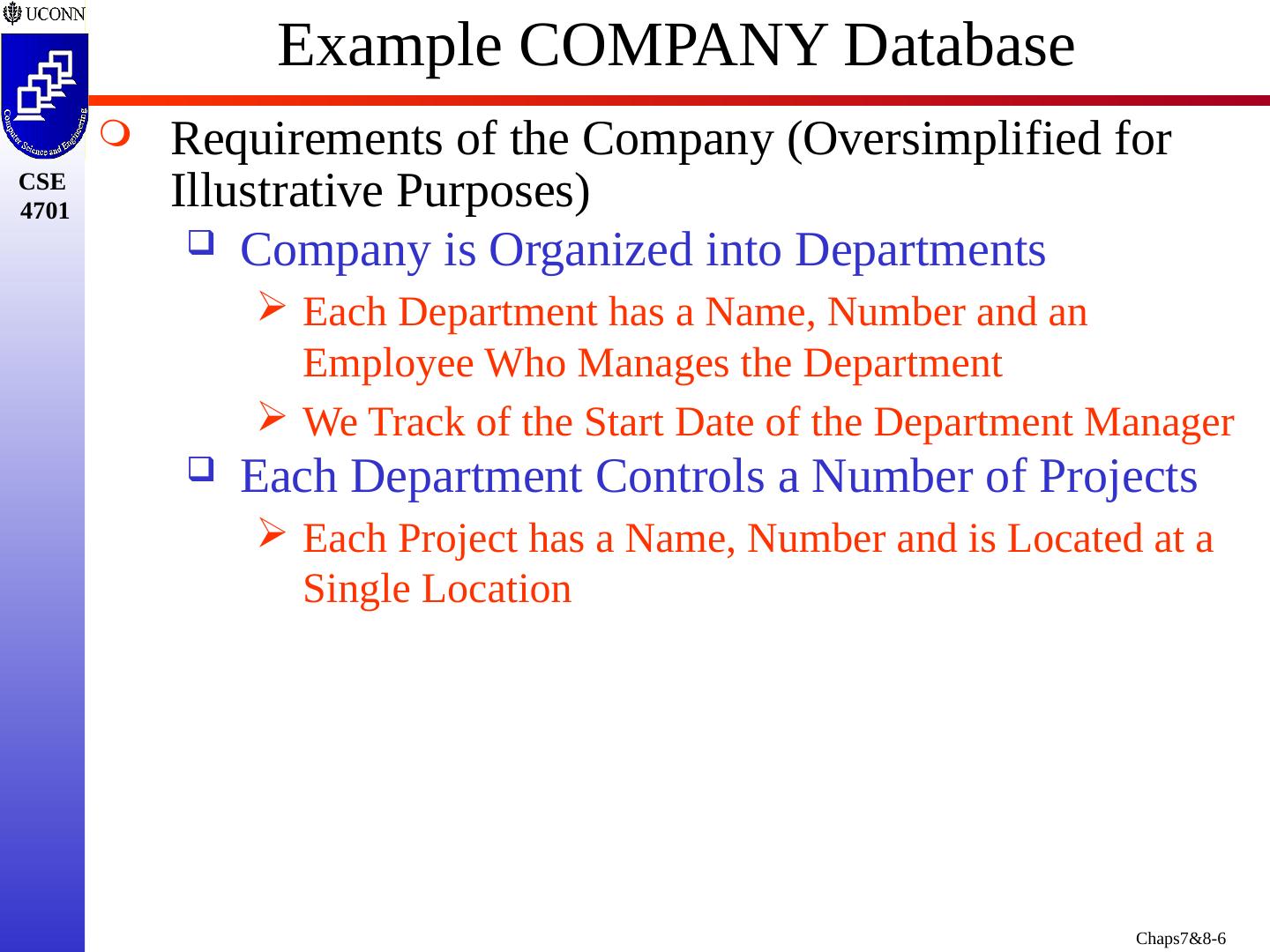 6 .Example COMPANY Database Requirements of the Company (Oversimplified for Illustrative Purposes) Company is Organized into Departments Each Department has a Name, Number and an Employee Who Manages the Department We Track of the Start Date of the Department Manager Each Department Controls a Number of Projects Each Project has a Name, Number and is Located at a Single Location