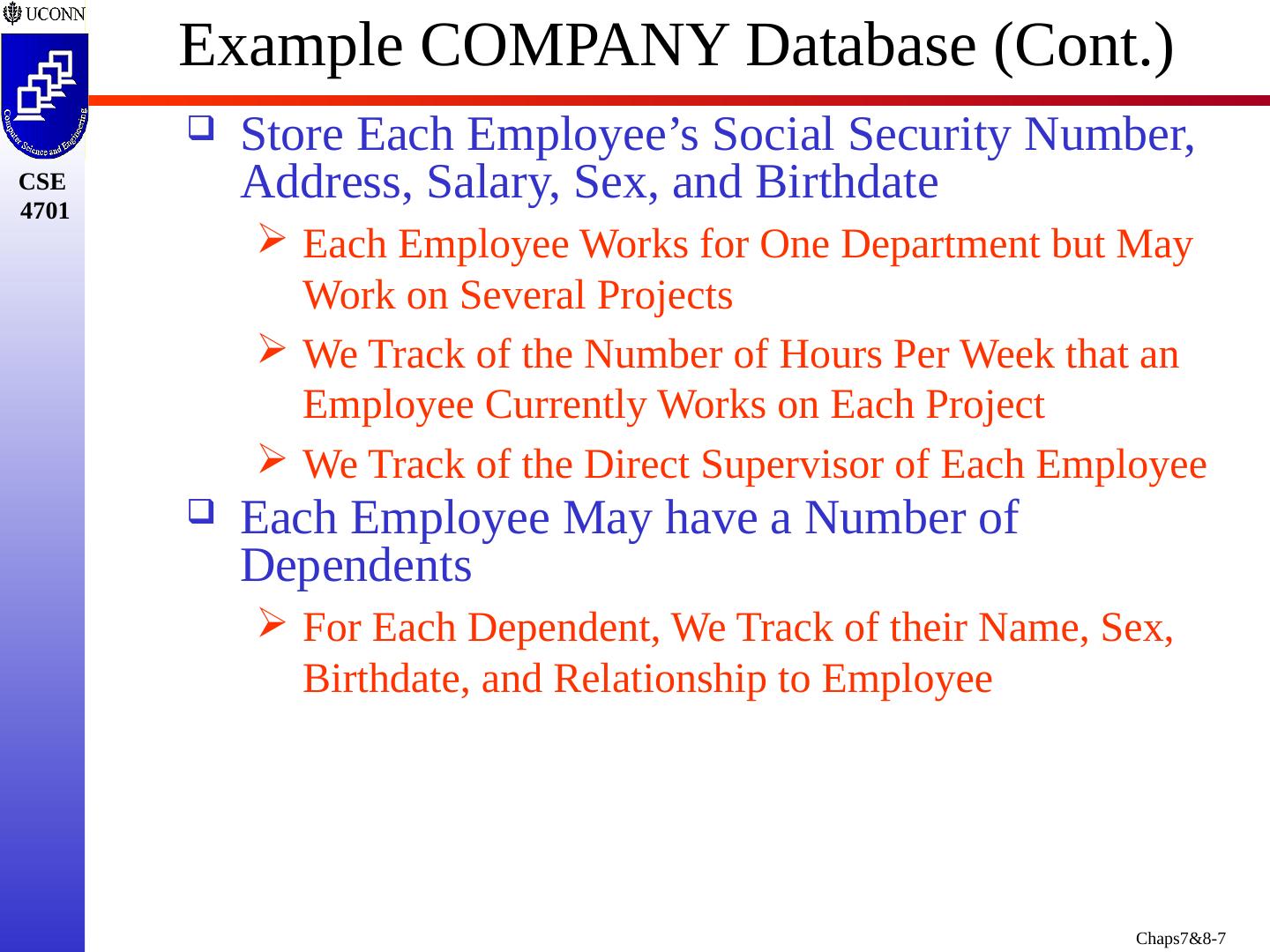 7 .Example COMPANY Database (Cont.) Store Each Employee’s Social Security Number, Address, Salary, Sex, and Birthdate Each Employee Works for One Department but May Work on Several Projects We Track of the Number of Hours Per Week that an Employee Currently Works on Each Project We Track of the Direct Supervisor of Each Employee Each Employee May have a Number of Dependents For Each Dependent, We Track of their Name, Sex, Birthdate, and Relationship to Employee