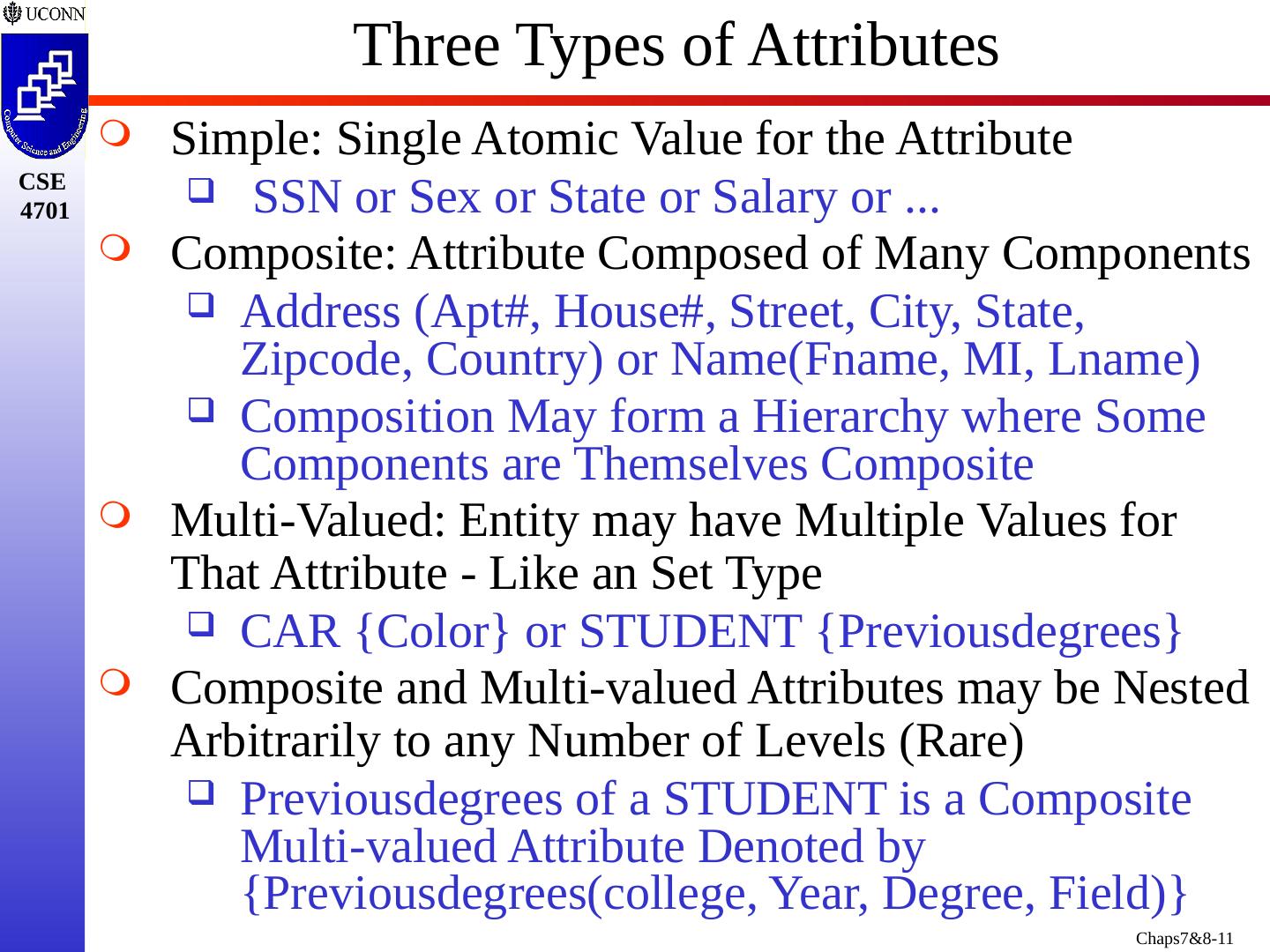 11 .Three Types of Attributes Simple: Single Atomic Value for the Attribute SSN or Sex or State or Salary or ... Composite: Attribute Composed of Many Components Address (Apt#, House#, Street, City, State, Zipcode, Country) or Name(Fname, MI, Lname) Composition May form a Hierarchy where Some Components are Themselves Composite Multi-Valued: Entity may have Multiple Values for That Attribute - Like an Set Type CAR {Color} or STUDENT {Previousdegrees} Composite and Multi-valued Attributes may be Nested Arbitrarily to any Number of Levels (Rare) Previousdegrees of a STUDENT is a Composite Multi-valued Attribute Denoted by {Previousdegrees(college, Year, Degree, Field)}