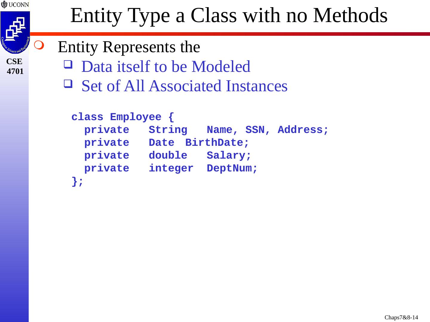 14 .Entity Type a Class with no Methods Entity Represents the Data itself to be Modeled Set of All Associated Instances class Employee { private String Name, SSN, Address; private Date BirthDate ; private double Salary; private integer DeptNum ; };