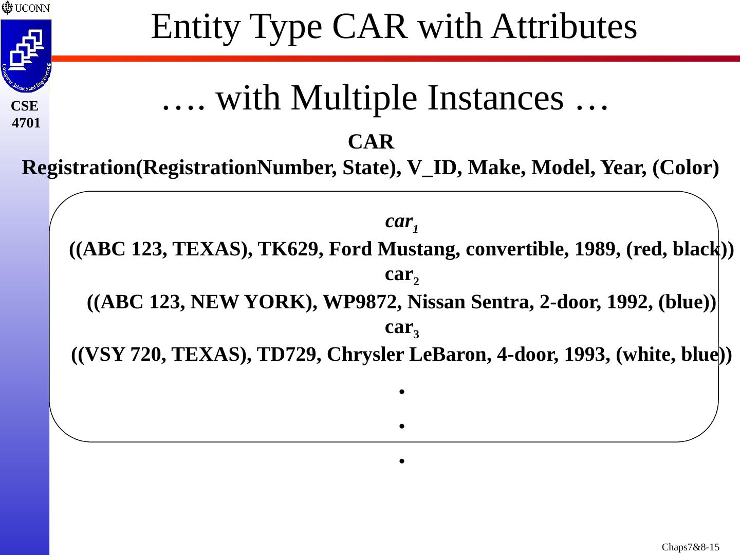 15 .car 1 ((ABC 123, TEXAS), TK629, Ford Mustang, convertible, 1989, (red, black)) car 2 ((ABC 123, NEW YORK), WP9872, Nissan Sentra, 2-door, 1992, (blue)) car 3 ((VSY 720, TEXAS), TD729, Chrysler LeBaron, 4-door, 1993, (white, blue)) . . . CAR Registration(RegistrationNumber, State), V_ID, Make, Model, Year, (Color) Entity Type CAR with Attributes …. with Multiple Instances …