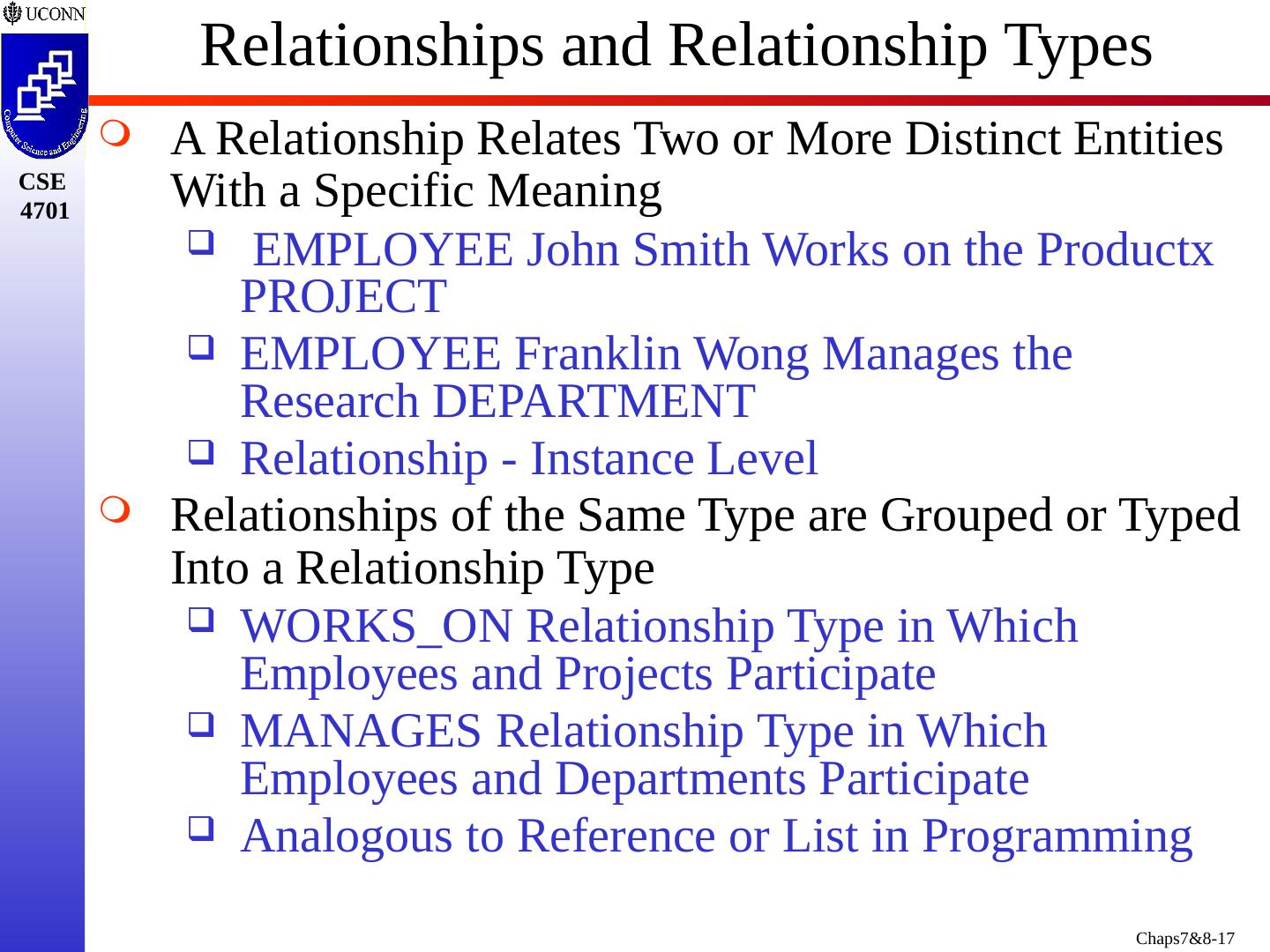 17 .Relationships and Relationship Types A Relationship Relates Two or More Distinct Entities With a Specific Meaning EMPLOYEE John Smith Works on the Productx PROJECT EMPLOYEE Franklin Wong Manages the Research DEPARTMENT Relationship - Instance Level Relationships of the Same Type are Grouped or Typed Into a Relationship Type WORKS_ON Relationship Type in Which Employees and Projects Participate MANAGES Relationship Type in Which Employees and Departments Participate Analogous to Reference or List in Programming