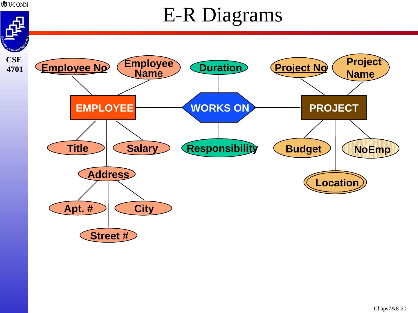 20 .E-R Diagrams EMPLOYEE PROJECT Responsibility Duration Budget Project Name Project No Employee No Employee Name Salary Title WORKS ON Address City Apt. # Street # NoEmp Location