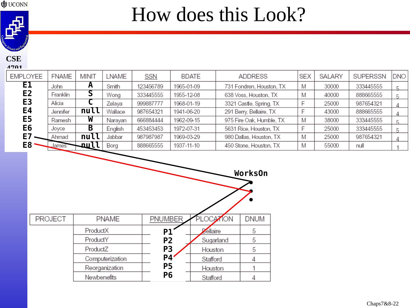 22 .How does this Look? A S C null W B null null E1 E2 E3 E4 E5 E6 E7 E8 WorksOn ● ● ● P1 P 2 P3 P4 P 5 P6