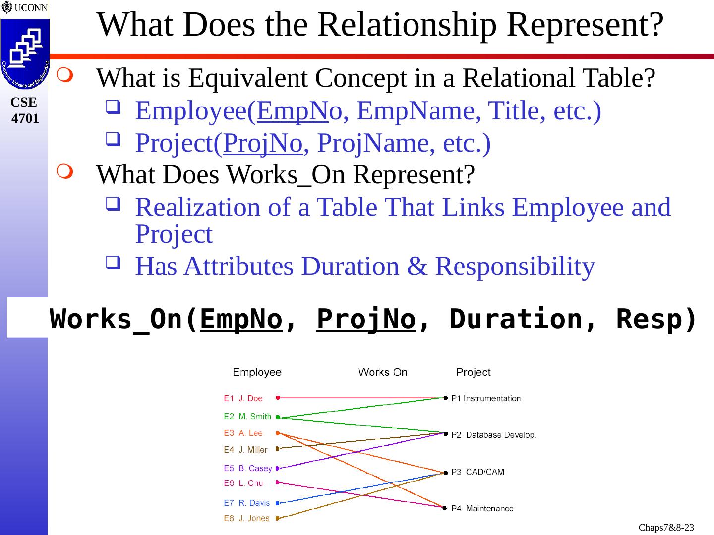 23 .What Does the Relationship Represent? What is Equivalent Concept in a Relational Table? Employee( EmpN o , EmpName , Title, etc.) Project( ProjNo , ProjName , etc.) What Does Works_On Represent? Realization of a Table That Links Employee and Project Has Attributes Duration & Responsibility Works_On ( EmpNo , ProjNo , Duration, Resp )
