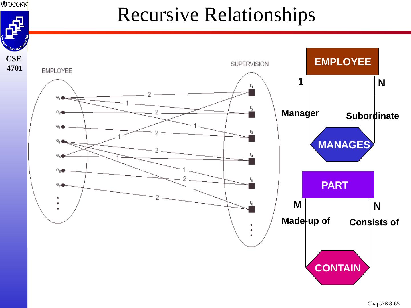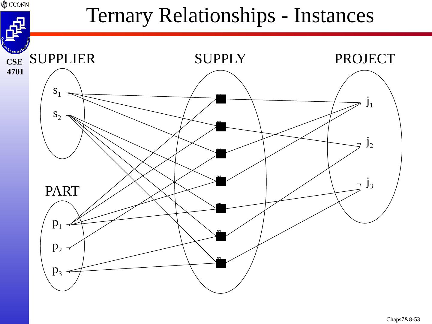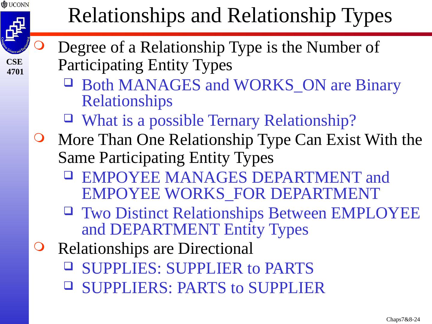 24 .Relationships and Relationship Types Degree of a Relationship Type is the Number of Participating Entity Types Both MANAGES and WORKS_ON are Binary Relationships What is a possible Ternary Relationship? More Than One Relationship Type Can Exist With the Same Participating Entity Types EMPOYEE MANAGES DEPARTMENT and EMPOYEE WORKS_FOR DEPARTMENT Two Distinct Relationships Between EMPLOYEE and DEPARTMENT Entity Types Relationships are Directional SUPPLIES: SUPPLIER to PARTS SUPPLIERS: PARTS to SUPPLIER