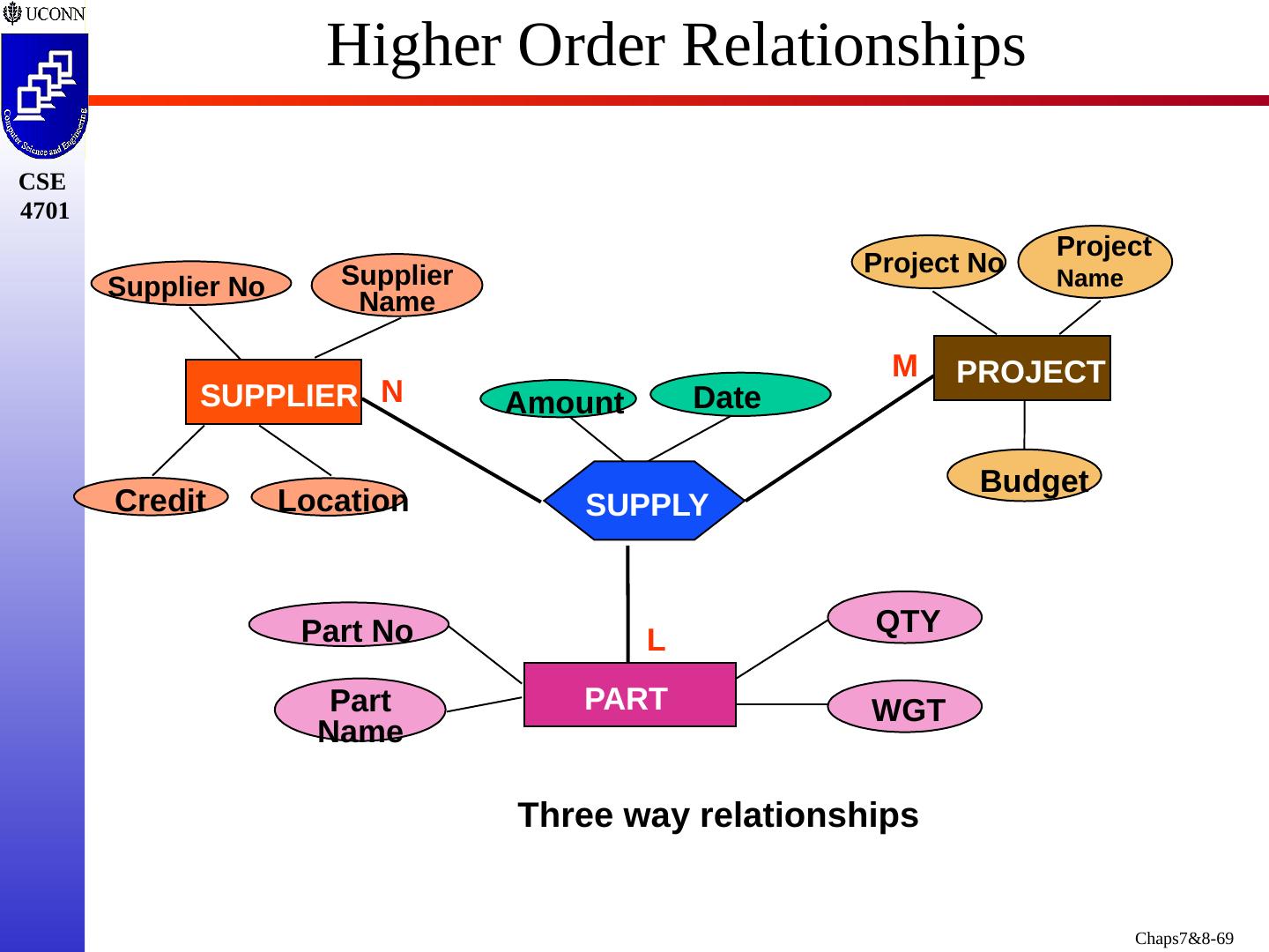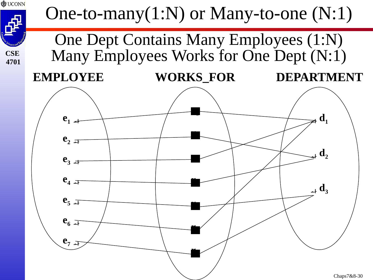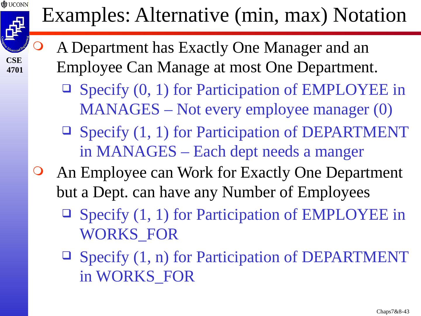 24 .Relationships and Relationship Types Degree of a Relationship Type is the Number of Participating Entity Types Both MANAGES and WORKS_ON are Binary Relationships What is a possible Ternary Relationship? More Than One Relationship Type Can Exist With the Same Participating Entity Types EMPOYEE MANAGES DEPARTMENT and EMPOYEE WORKS_FOR DEPARTMENT Two Distinct Relationships Between EMPLOYEE and DEPARTMENT Entity Types Relationships are Directional SUPPLIES: SUPPLIER to PARTS SUPPLIERS: PARTS to SUPPLIER