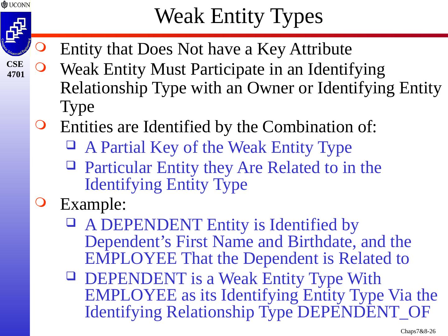 26 .Weak Entity Types Entity that Does Not have a Key Attribute Weak Entity Must Participate in an Identifying Relationship Type with an Owner or Identifying Entity Type Entities are Identified by the Combination of: A Partial Key of the Weak Entity Type Particular Entity they Are Related to in the Identifying Entity Type Example: A DEPENDENT Entity is Identified by Dependent’s First Name and Birthdate, and the EMPLOYEE That the Dependent is Related to DEPENDENT is a Weak Entity Type With EMPLOYEE as its Identifying Entity Type Via the Identifying Relationship Type DEPENDENT_OF