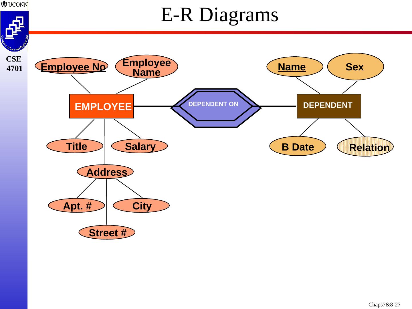 27 .E-R Diagrams EMPLOYEE DEPENDENT B Date Sex Name Employee No Employee Name Salary Title DEPENDENT ON Address City Apt. # Street # Relation