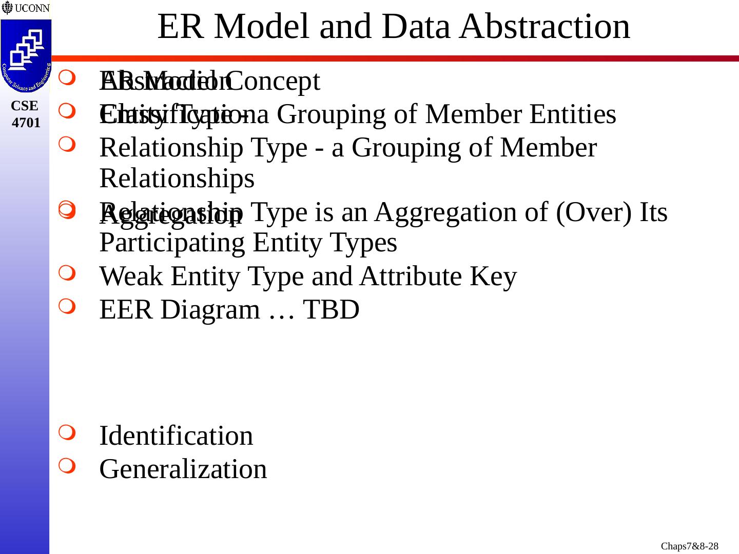 28 .ER Model and Data Abstraction Abstraction Classification Aggregation Identification Generalization ER Model Concept Entity Type - a Grouping of Member Entities Relationship Type - a Grouping of Member Relationships Relationship Type is an Aggregation of (Over) Its Participating Entity Types Weak Entity Type and Attribute Key EER Diagram … TBD