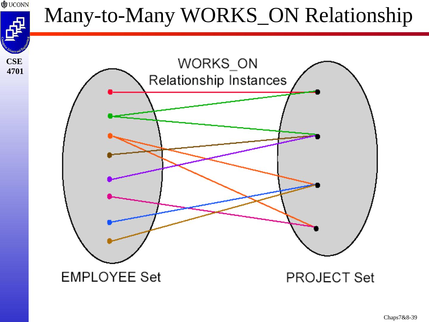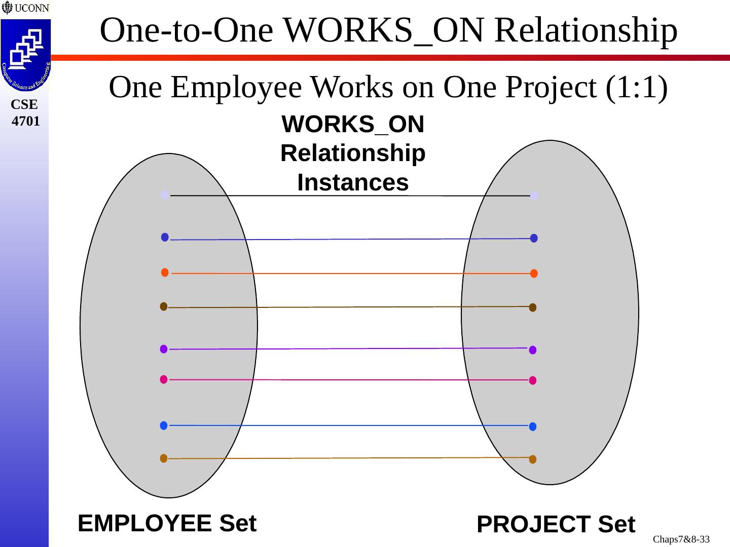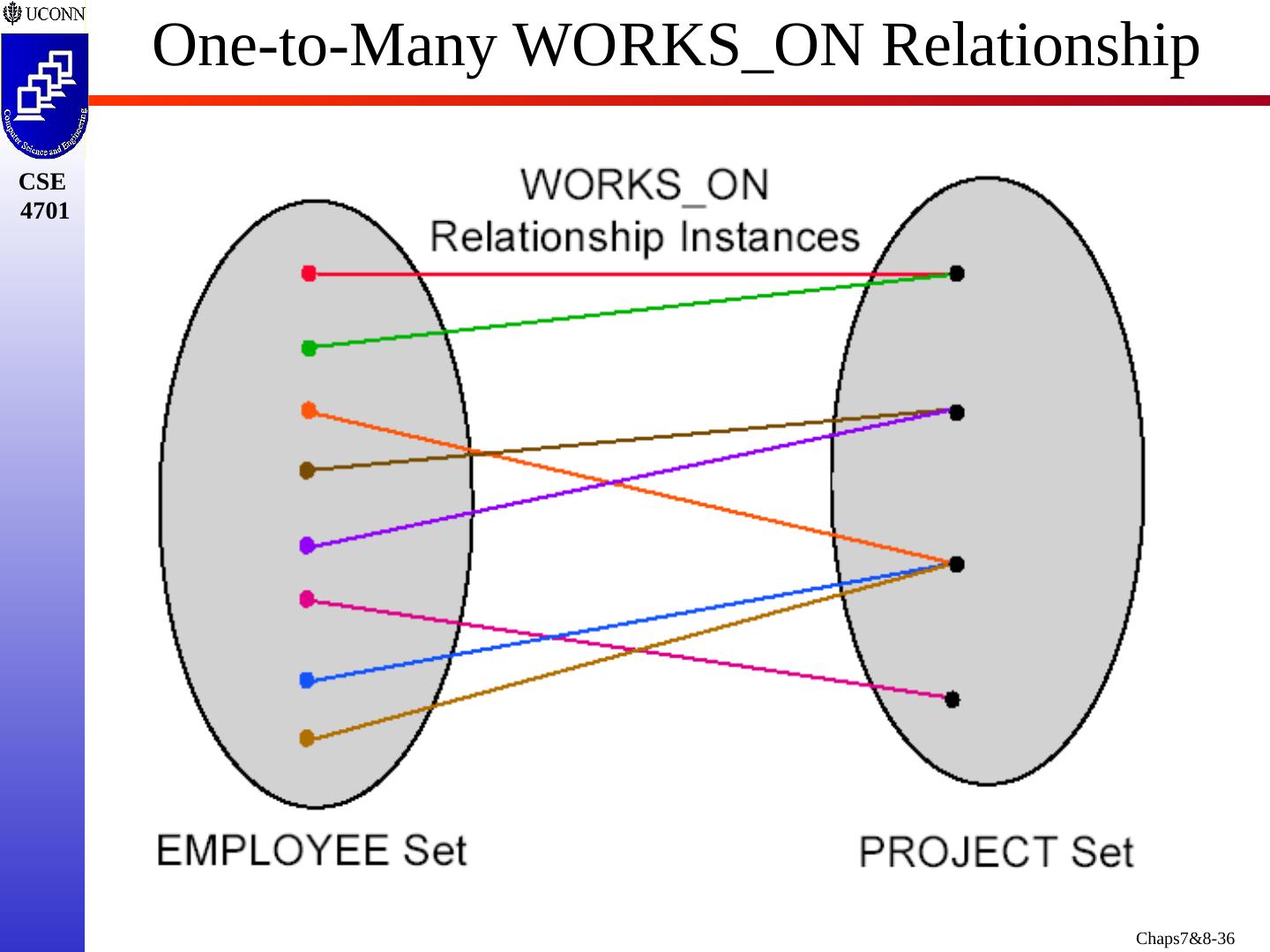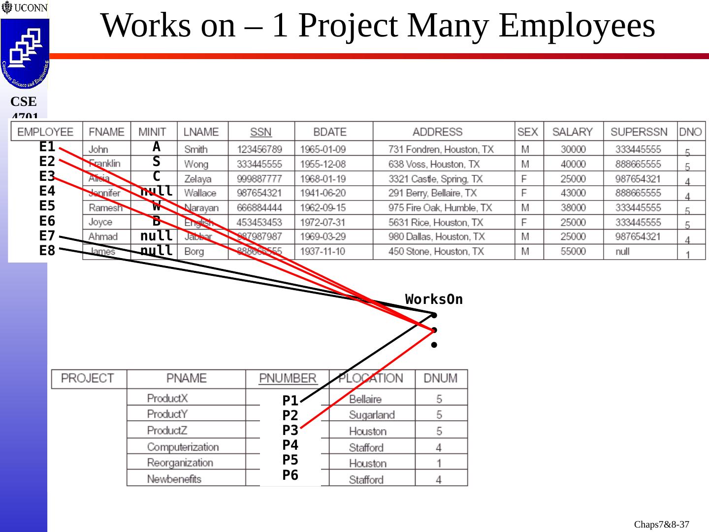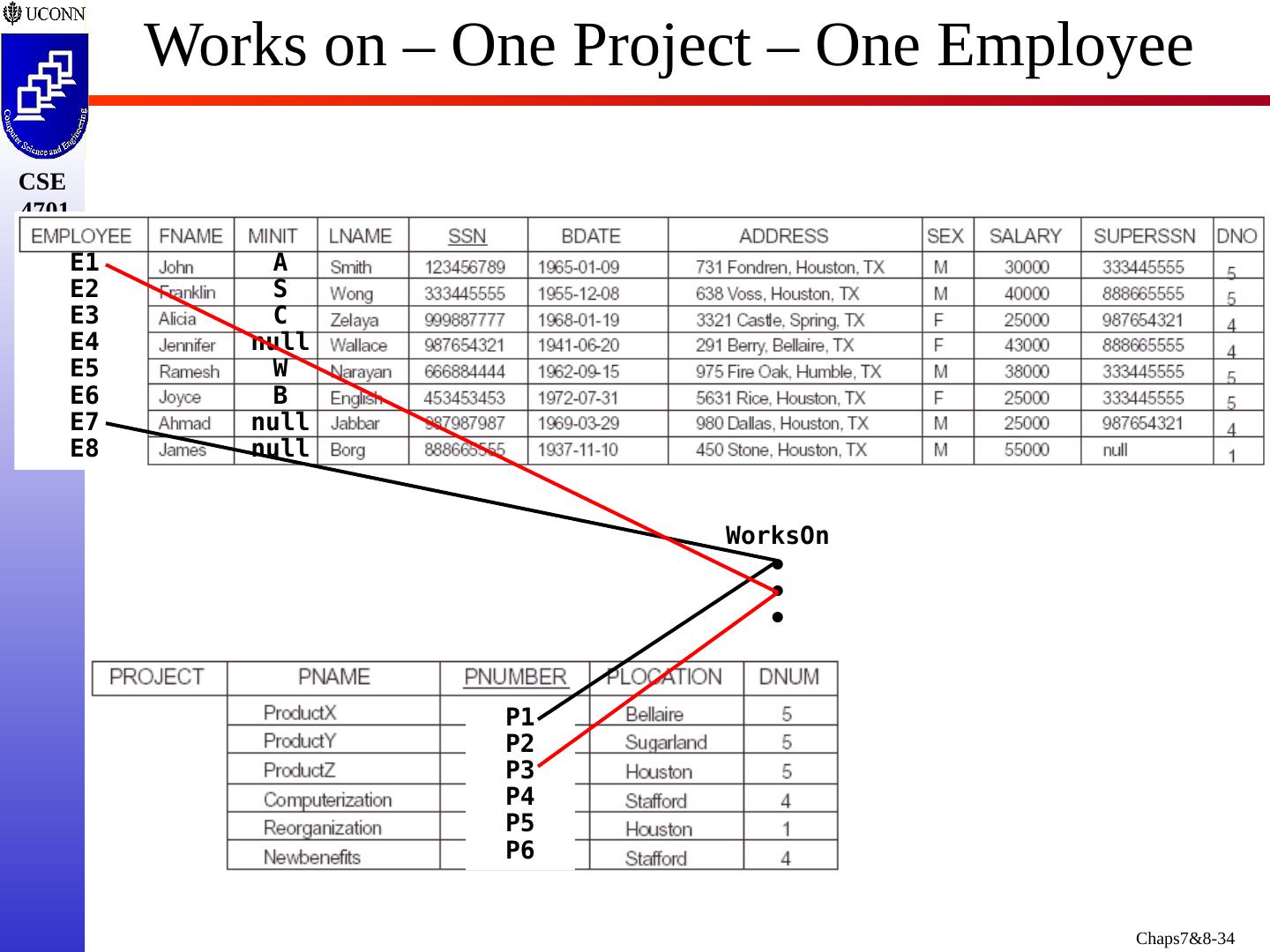 21 .The WORKS_ON Relationship E1 to P1 – J. Doe Works on Instrumentation E3 to P3 – A. Lee Works on CAD/CAM P2 to E2 and P2 to E4 and P2 to E5 All of the Employees working on DB Development