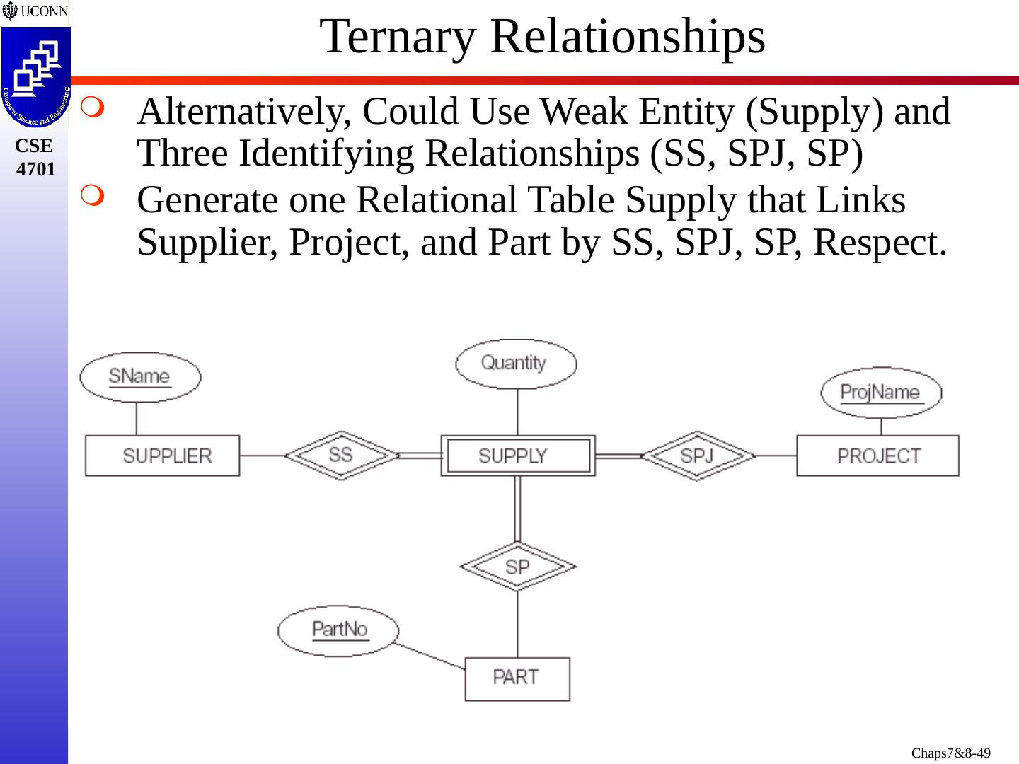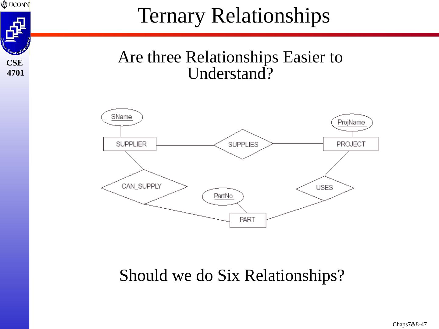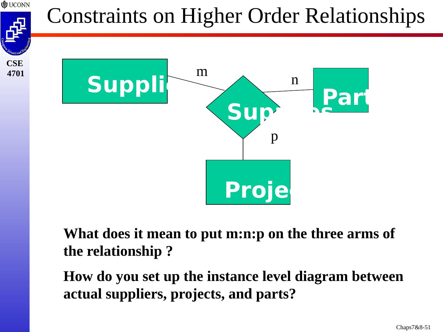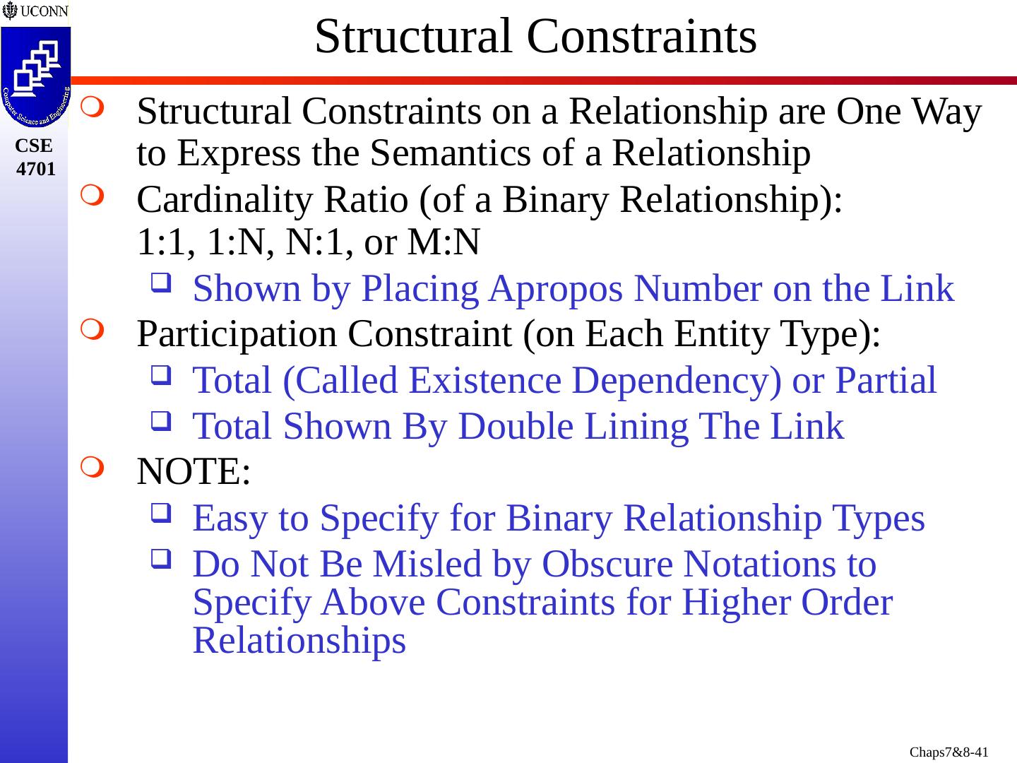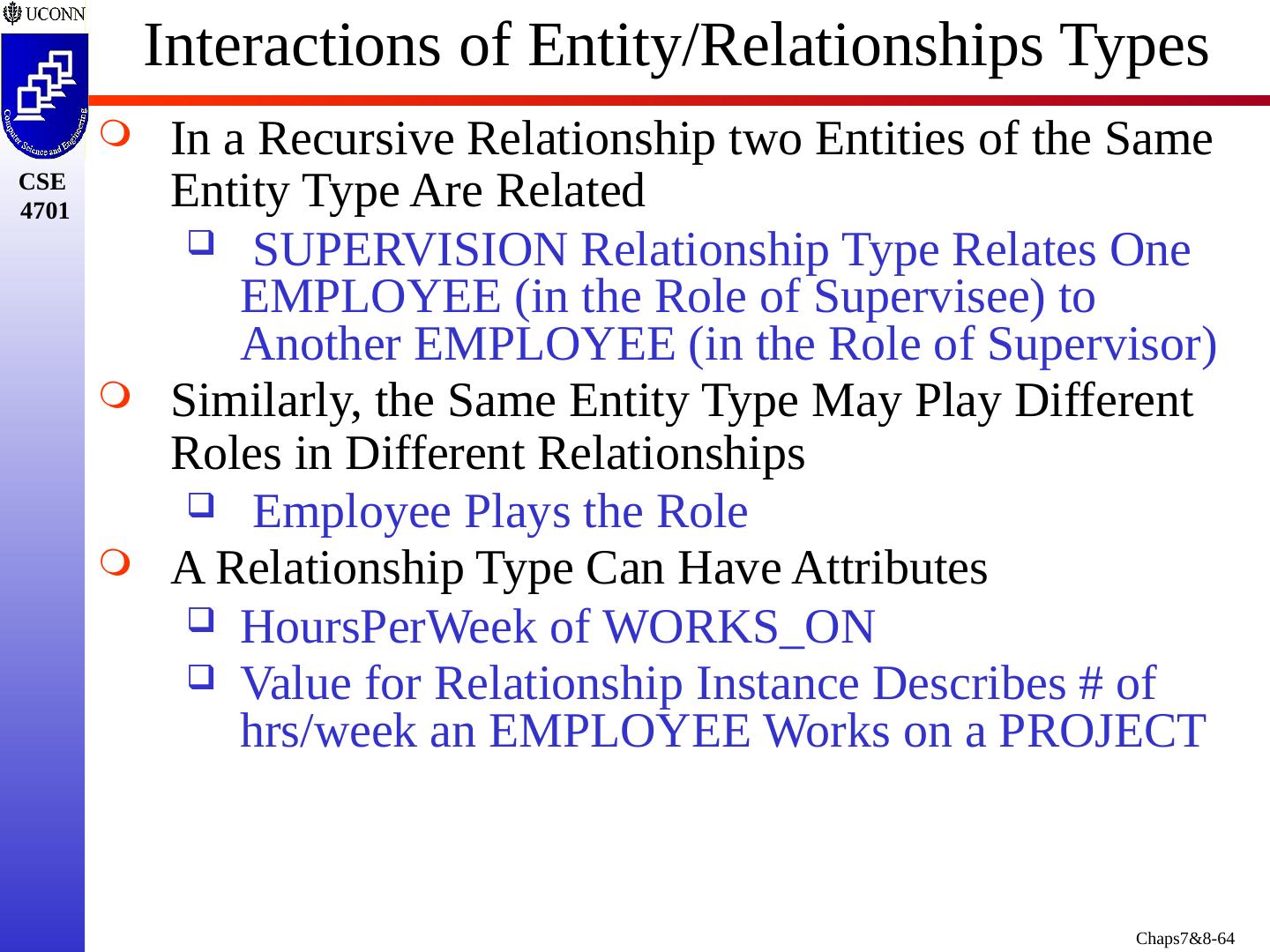 25 .Relationships and Relationship Types Degree of a Relationship Type is the Number of Participating Entity Types Both MANAGES and WORKS_ON are Binary Relationships What is a possible Ternary Relationship? More Than One Relationship Type Can Exist With the Same Participating Entity Types EMPOYEE MANAGES DEPARTMENT and EMPOYEE WORKS_FOR DEPARTMENT Two Distinct Relationships Between EMPLOYEE and DEPARTMENT Entity Types Relationships are Directional SUPPLIES: SUPPLIER to PARTS SUPPLIERS: PARTS to SUPPLIER