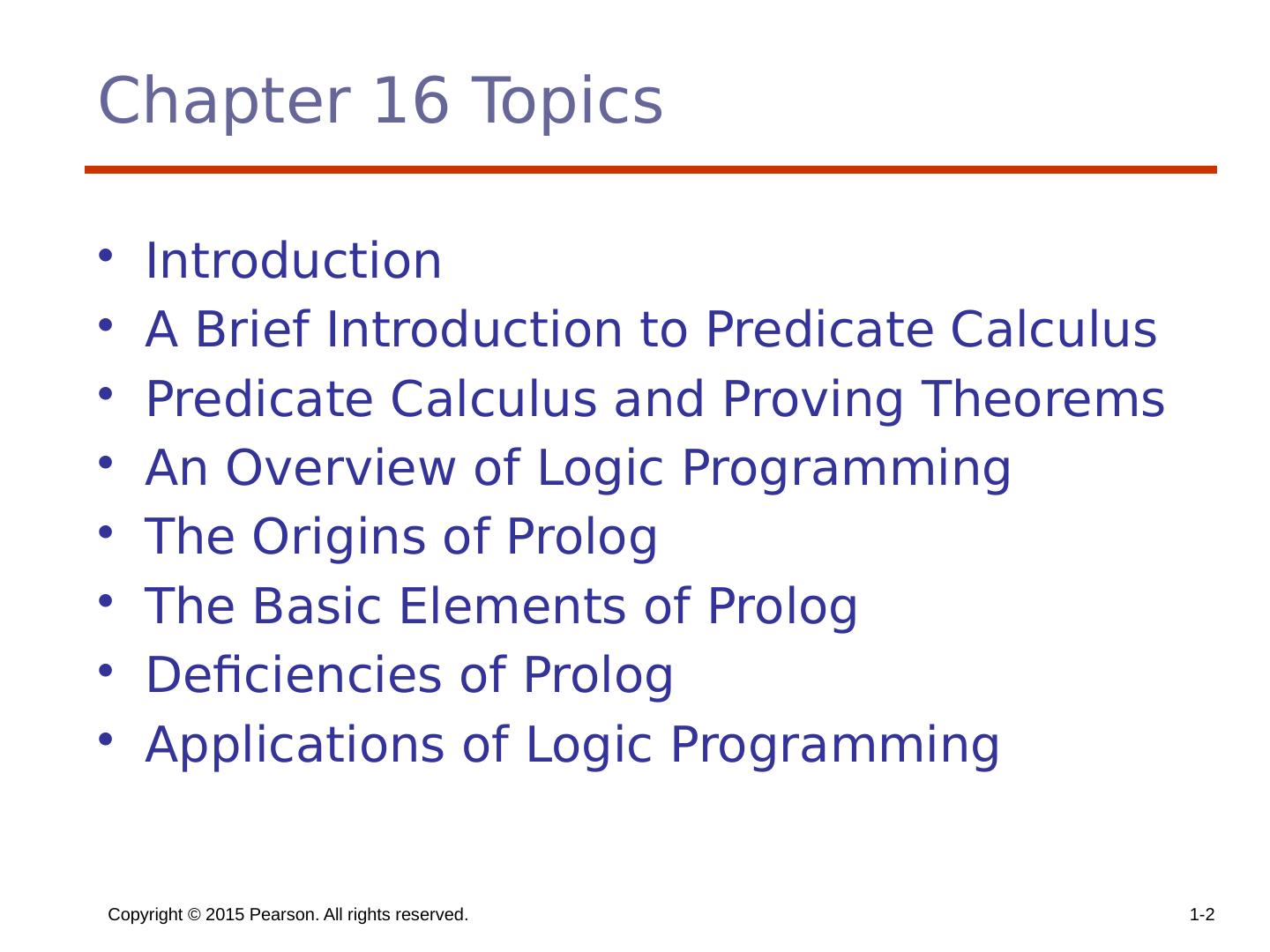 2 .Copyright © 2015 Pearson. All rights reserved. 1- 2 Chapter 16 Topics Introduction A Brief Introduction to Predicate Calculus Predicate Calculus and Proving Theorems An Overview of Logic Programming The Origins of Prolog The Basic Elements of Prolog Deficiencies of Prolog Applications of Logic Programming