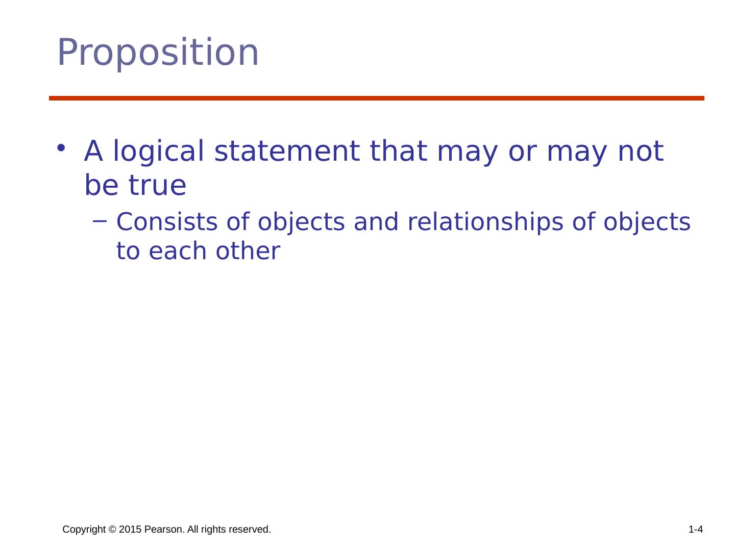 4 .Copyright © 2015 Pearson. All rights reserved. 1- 4 Proposition A logical statement that may or may not be true Consists of objects and relationships of objects to each other
