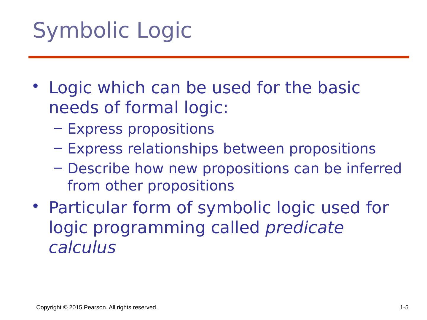 5 .Copyright © 2015 Pearson. All rights reserved. 1- 5 Symbolic Logic Logic which can be used for the basic needs of formal logic: Express propositions Express relationships between propositions Describe how new propositions can be inferred from other propositions Particular form of symbolic logic used for logic programming called predicate calculus