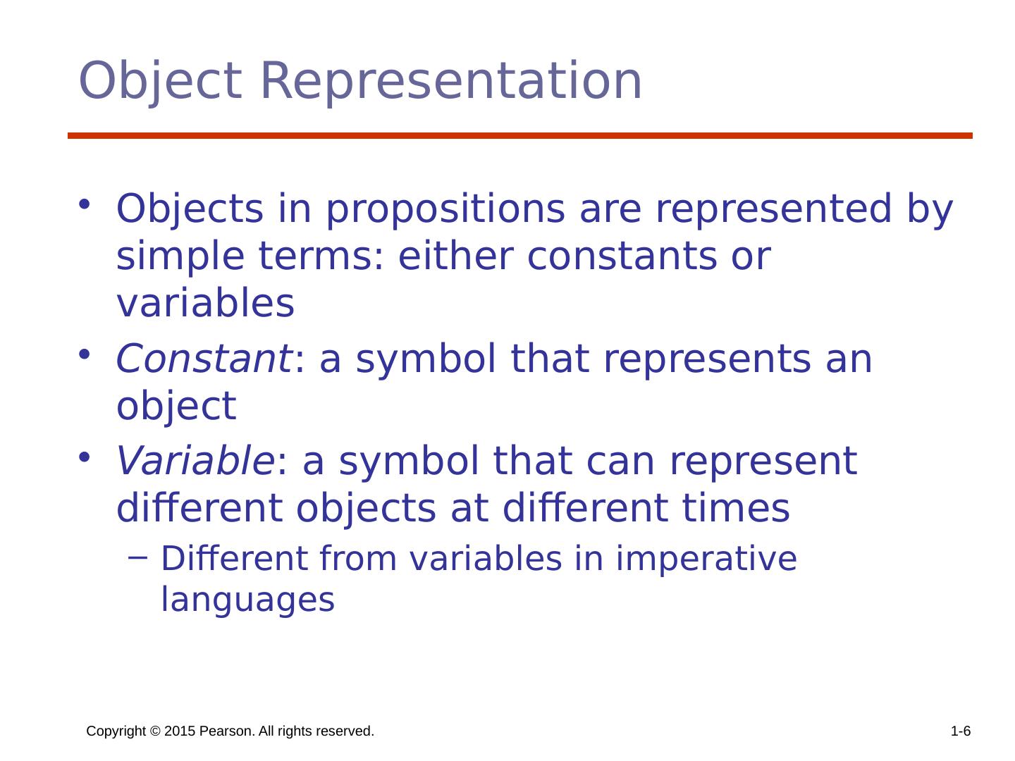 6 .Copyright © 2015 Pearson. All rights reserved. 1- 6 Object Representation Objects in propositions are represented by simple terms: either constants or variables Constant : a symbol that represents an object Variable : a symbol that can represent different objects at different times Different from variables in imperative languages
