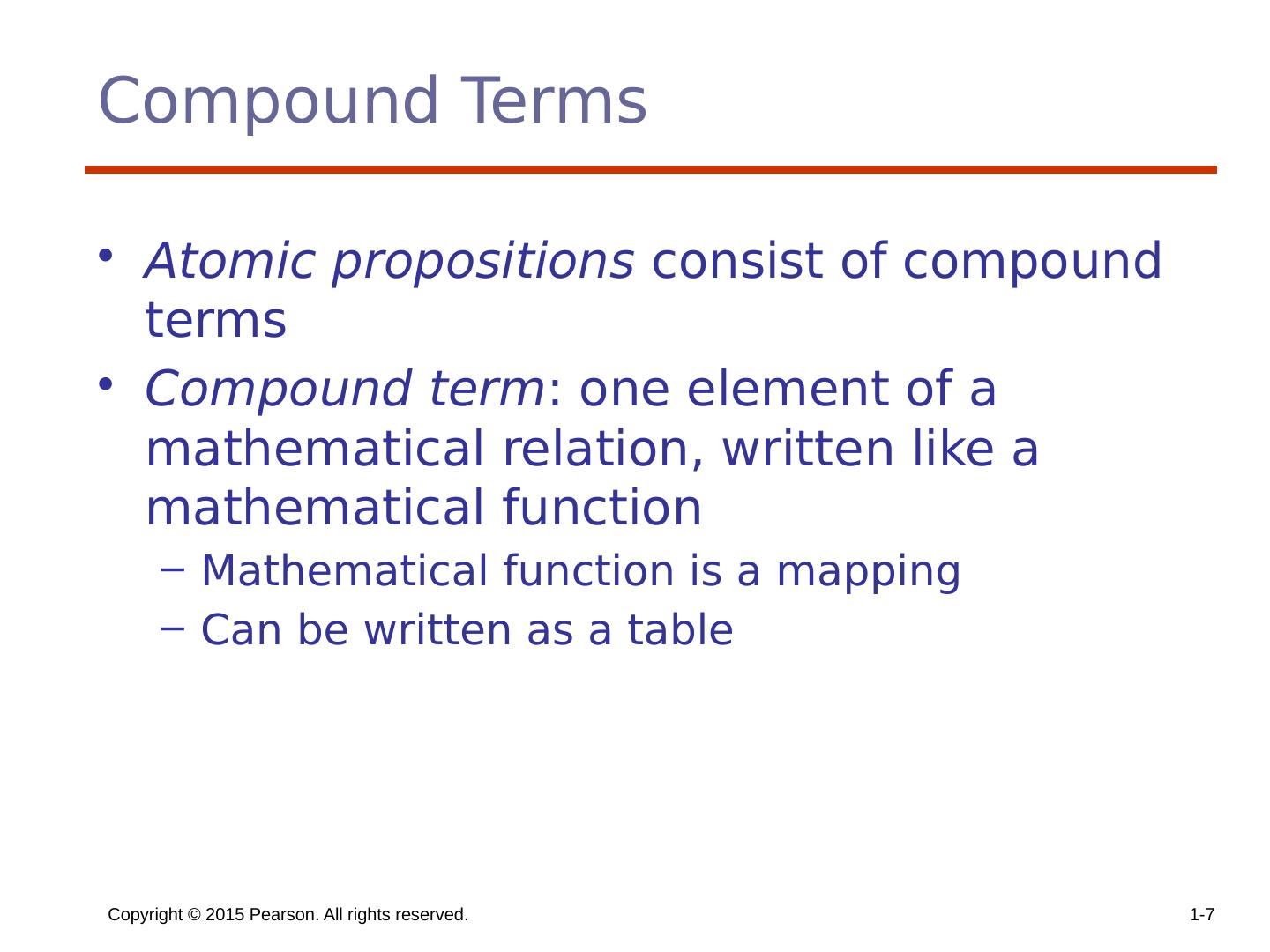 7 .Copyright © 2015 Pearson. All rights reserved. 1- 7 Compound Terms Atomic propositions consist of compound terms Compound term : one element of a mathematical relation, written like a mathematical function Mathematical function is a mapping Can be written as a table