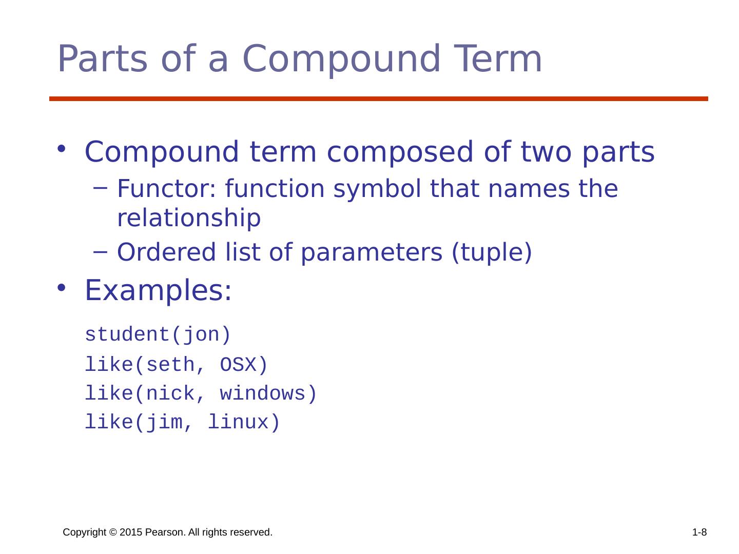 8 .Copyright © 2015 Pearson. All rights reserved. 1- 8 Parts of a Compound Term Compound term composed of two parts Functor: function symbol that names the relationship Ordered list of parameters (tuple) Examples: student(jon) like(seth, OSX) like(nick, windows) like(jim, linux)