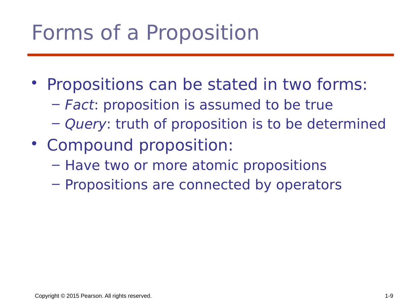 9 .Copyright © 2015 Pearson. All rights reserved. 1- 9 Forms of a Proposition Propositions can be stated in two forms: Fact : proposition is assumed to be true Query : truth of proposition is to be determined Compound proposition: Have two or more atomic propositions Propositions are connected by operators
