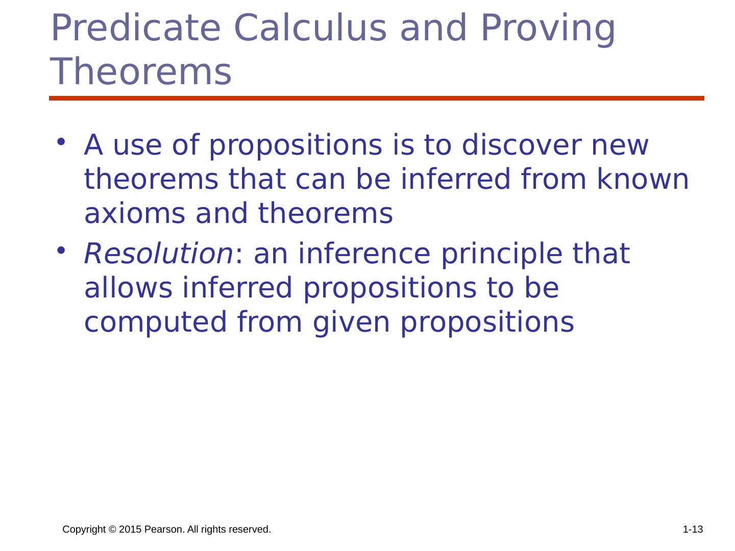 13 .Copyright © 2015 Pearson. All rights reserved. 1- 13 Predicate Calculus and Proving Theorems A use of propositions is to discover new theorems that can be inferred from known axioms and theorems Resolution : an inference principle that allows inferred propositions to be computed from given propositions