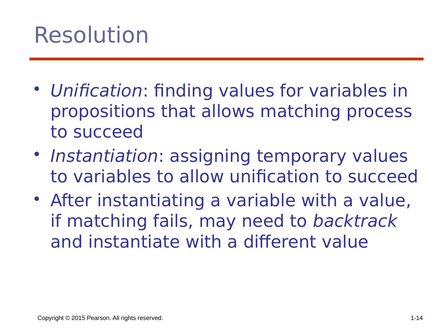 14 .Copyright © 2015 Pearson. All rights reserved. 1- 14 Resolution Unification : finding values for variables in propositions that allows matching process to succeed Instantiation : assigning temporary values to variables to allow unification to succeed After instantiating a variable with a value, if matching fails, may need to backtrack and instantiate with a different value