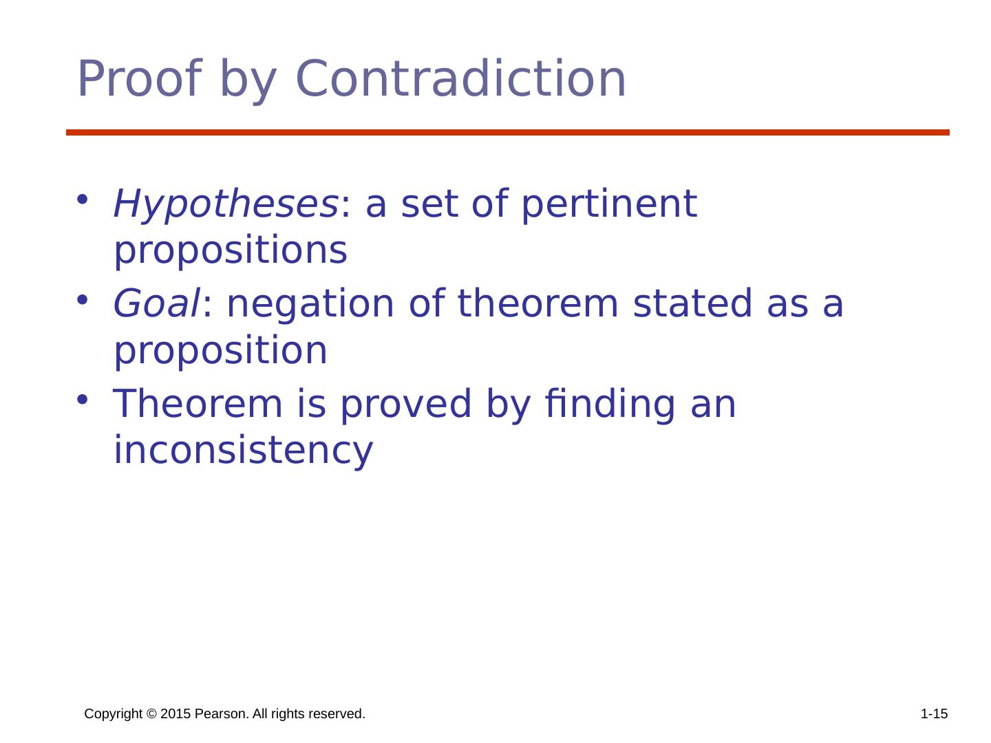15 .Copyright © 2015 Pearson. All rights reserved. 1- 15 Proof by Contradiction Hypotheses : a set of pertinent propositions Goal : negation of theorem stated as a proposition Theorem is proved by finding an inconsistency